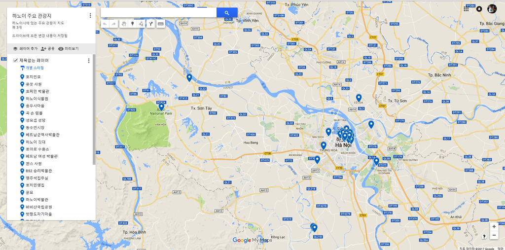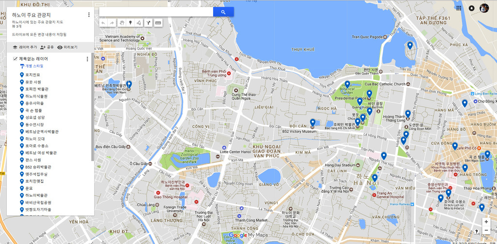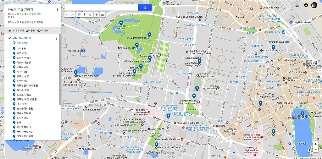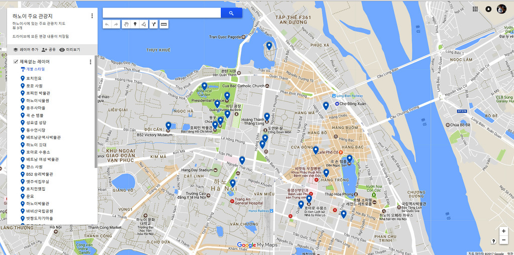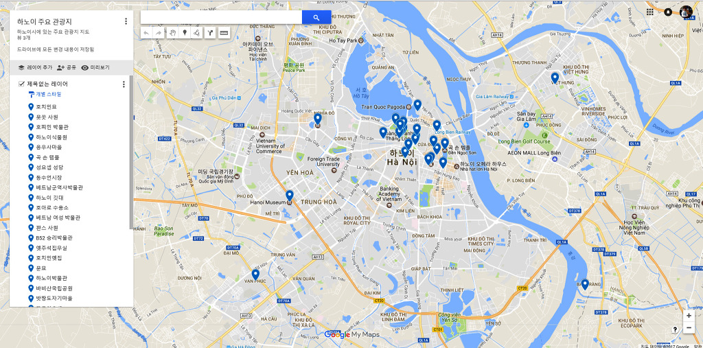 하노이의 주요 관광지 44개소를 구글지도에 표시하였다.