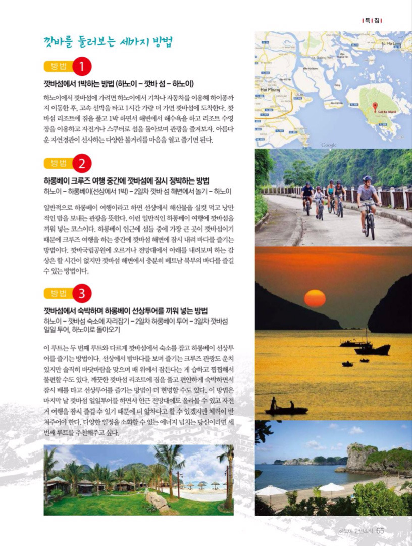 방법 1. 깟바섬에서 1박하는 방법 (하노이 – 깟바 섬 – 하노이) 하노이에서 깟바섬에 가려면 하노이에서 기차나 자동차를 이용해 하이퐁까지 이동한 후, 고속 선박을 타고 1시간 가량 더 가면 깟바섬에 도착한다. 깟바섬 리조트에 짐을 풀고 1박 하면서 해변에서 해수욕을 하고 리조트 수영장을 이용하고 자전거나 스쿠터로 섬을 돌아보며 관광을 즐겨보자. 아름다운 자연경관이 선사하는 다양한 볼거리를 마음을 열고 즐기면 된다.
