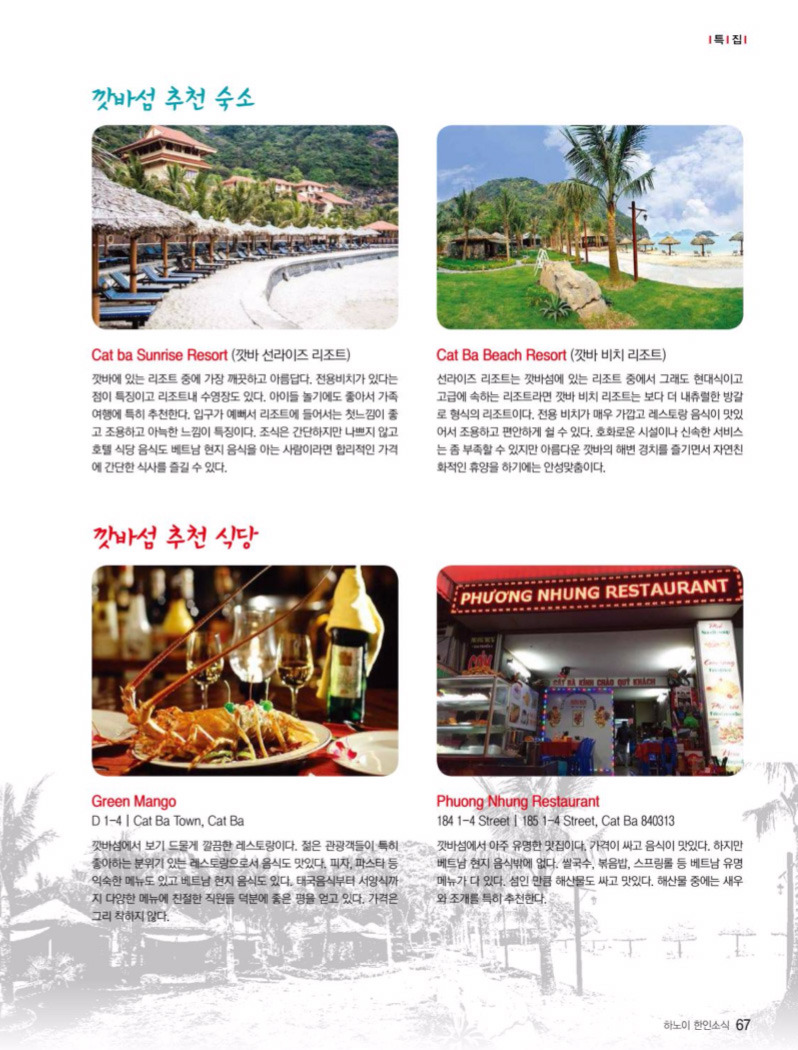 Cat Ba Beach Resort (깟바 비치 리조트) 선라이즈 리조트는 깟바섬에 있는 리조트 중에서 그래도 현대식이고 고급에 속하는 리조트라면 깟바 비치 리조트는 보다 더 내츄럴한 방갈로 형식의 리조트이다. 전용 비치가 매우 가깝고 레스토랑 음식이 맛있어서 조용하고 편안하게 쉴 수 있다. 호화로운 시설이나 신속한 서비스는 좀 부족할 수 있지만 아름다운 깟바의 해변 경치를 즐기면서 자연친화적인 휴양을 하기에는 안성맞춤이다.