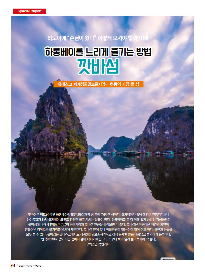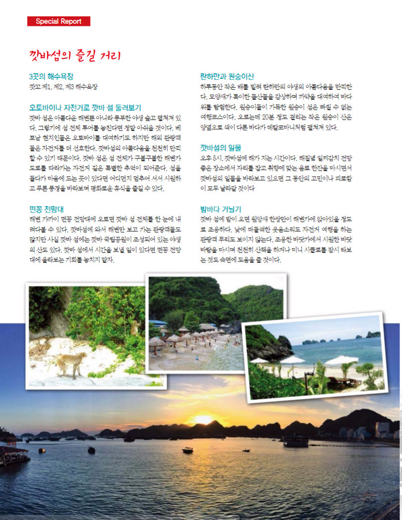 깟바섬은 베트남 북부 하롱베이에 딸린 366여개의 섬 중에 가장 큰 섬이다. 하롱베이가 워낙 유명한 관광지다보니 하이퐁까지 와서 하롱베이 크루즈 관광만 하고 가시는 분들이 많다. 하롱베이를 좀 더 여유 있게 충분히 감상하려면 깟바섬에 내려서 1박쯤 머무르며 하롱베이와 깟바섬 인근을 둘러보면 더 좋다. 깟바섬은 아름다운 자연과 자연이 만들어낸 경이로운 볼거리를 넘치게 제공한다. 깟바섬 안에 깟바 국립공원이 있는 산이 있어 산과 바다, 해변과 하늘을 모두 볼 수 있다. 깟바섬은 유네스코에서도 세계생물권보존지역으로 정식 등재할 만큼 아름답고 볼거리가 풍부하다. 면적이 140Km2 정도 되는 섬이니 걸어 다니기에는 크고 스쿠터 하나 빌려 둘러보기에 딱 좋다. /최소연 객원기자