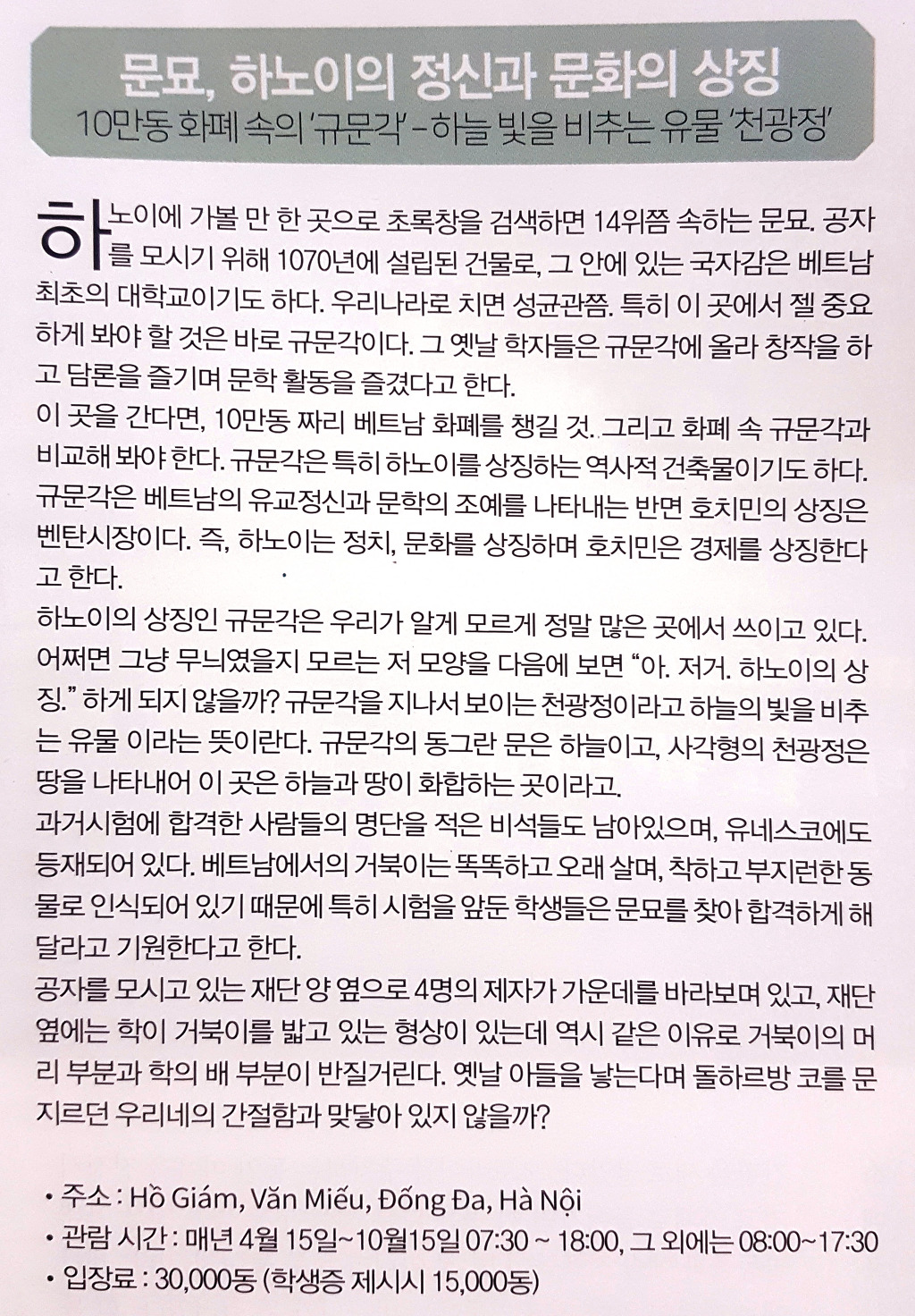 이 곳을 간다면, 10만동 짜리 베트남 화폐를 챙길 것. 그리고 화폐 속 규문각과 비교해 봐야 한다.
