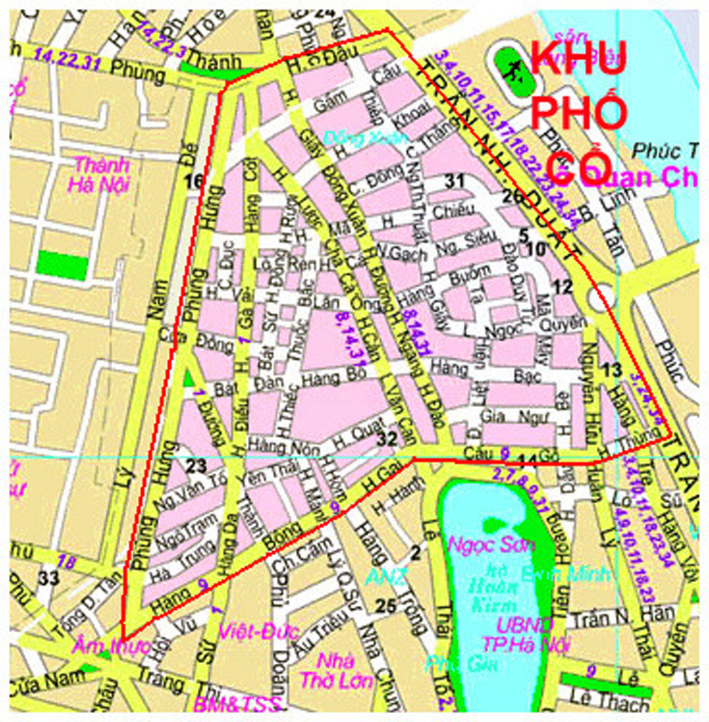 북부 쪽에서 하노이로 들어오다 보면 항 콰이(Hàng Khoai) 거리에서는 이제 그릇을 팔고, 항가(Hàng Gà) 거리에서는 결혼식 초대장을 인쇄하는 등 자연스럽게 바뀌어가고 있다.
