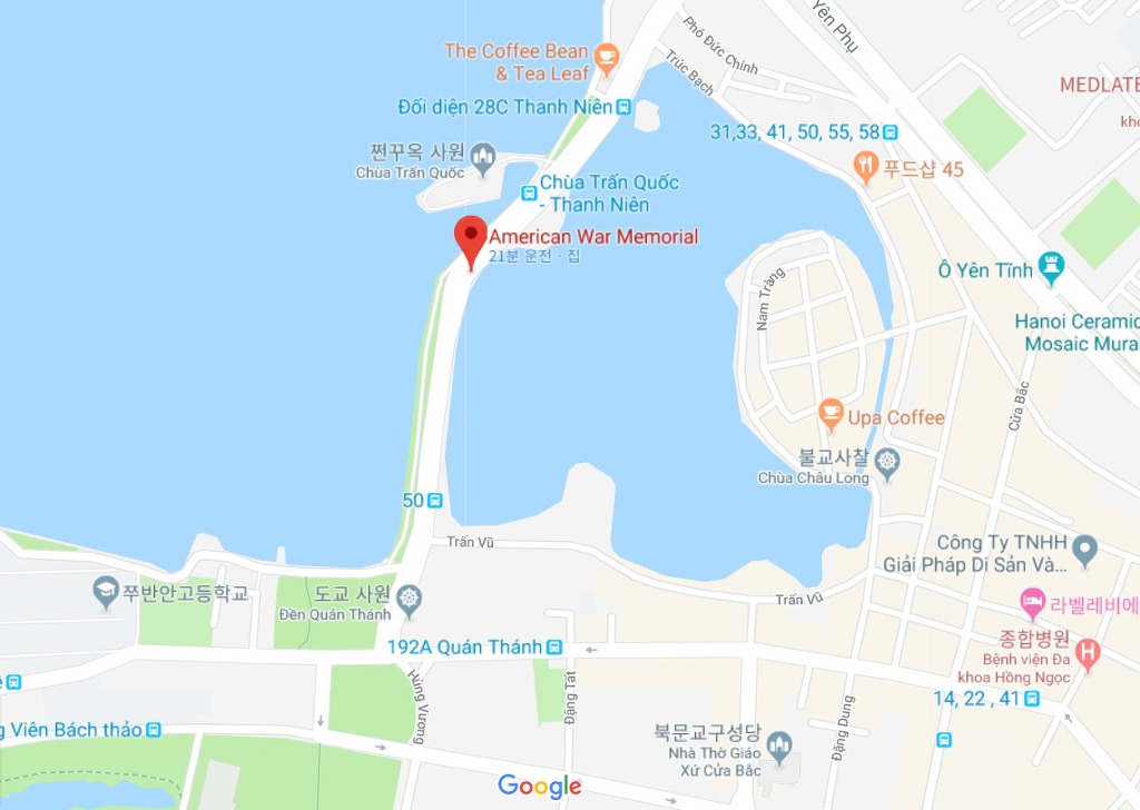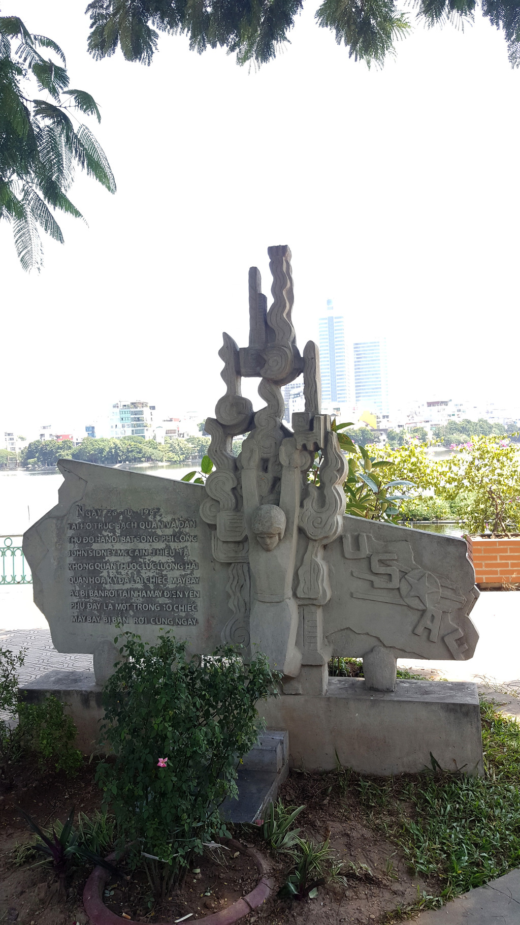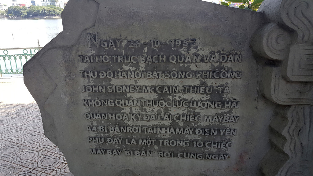 베트남은 이곳 쭉박호 변에 그의 추락사실을 기록한 기념비를 세웠다. 기념비는 서호(Hồ Tây, 湖西)와 쭉박호(Hồ Trúc Bạch)를 둘로 가르는 도로의 쭉박호수 쪽 인도의 중심부에 세워져 있는데 기념비의 뒷 공간이 더 넓어 대부분 사람들이 이것을 보지 못하고 그냥 지나쳐 버린다. 기념비에는 매케인이 무릎을 꿇고 두 손을 들고 있는 모습인데, 당시 상황을 보면 호수에 추락 무의식 상태에서 병원으로 후송되었다는 내용으로 보아 그렇게 하지는 않은 것으로 보인다. 또한 여기에는 다음과 같이 적혀있다.