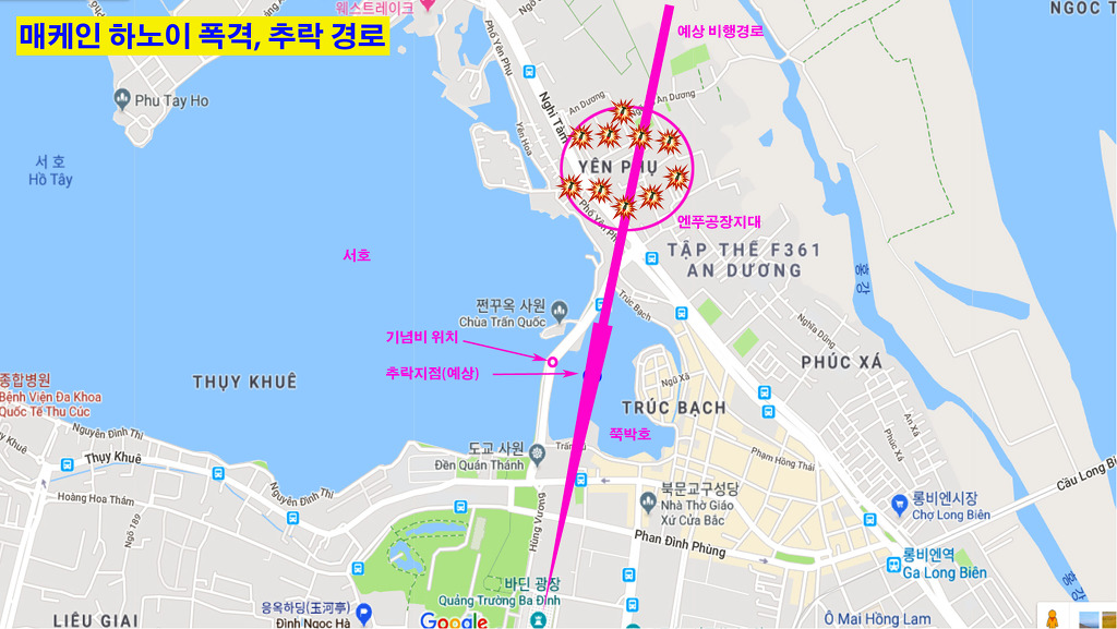 메케인이 공격한 엔푸 공장 지대와 추락한 지점을 근거로 추정해본 예상 비행 경로