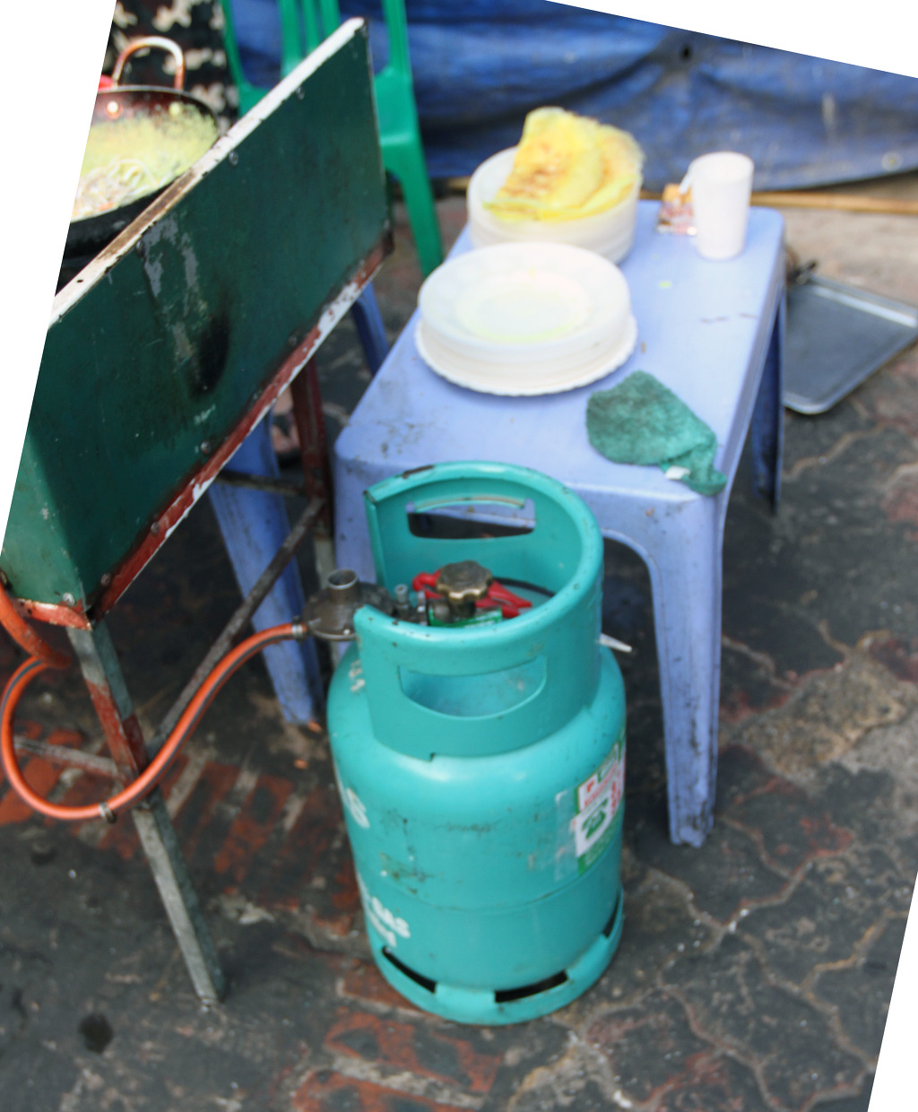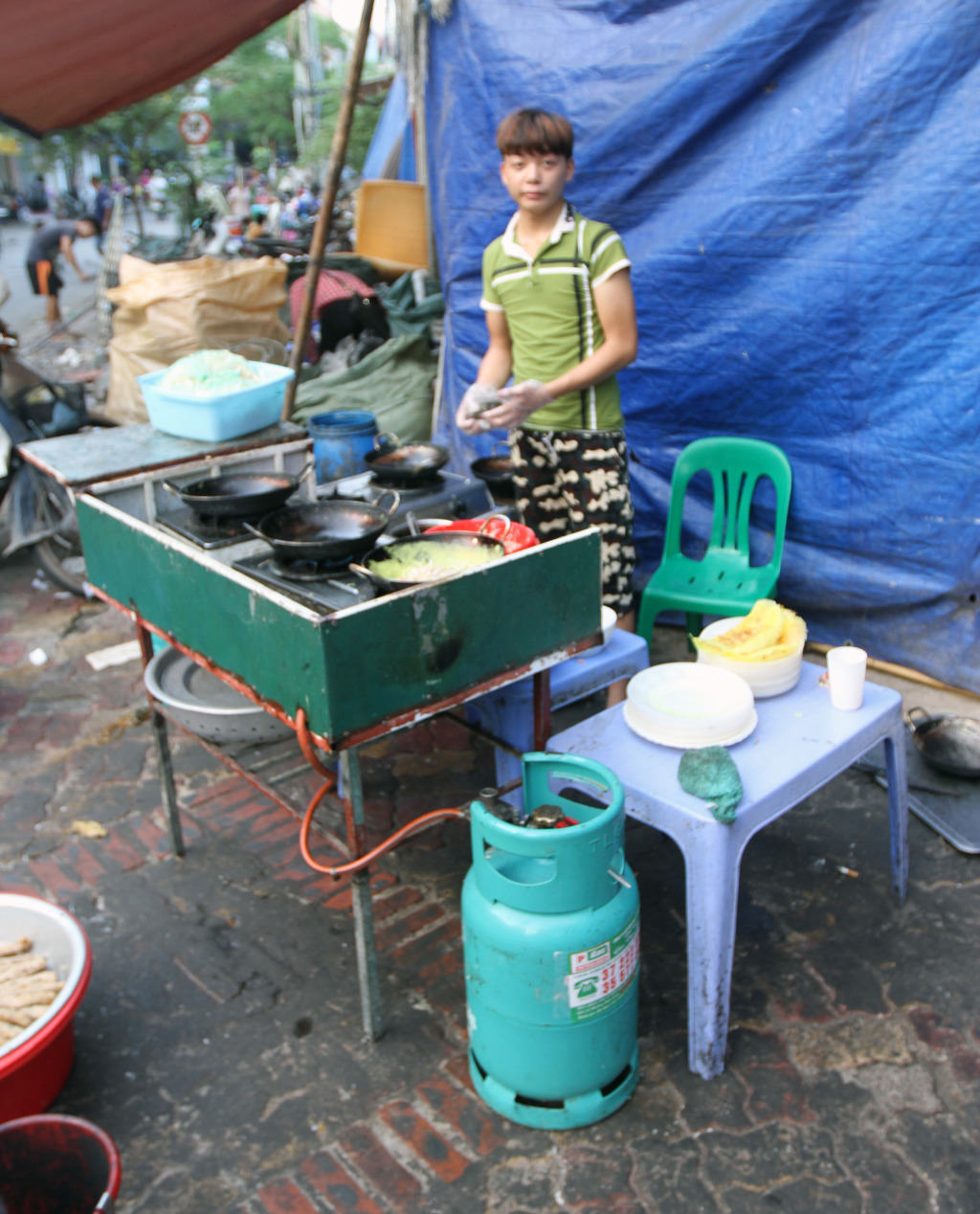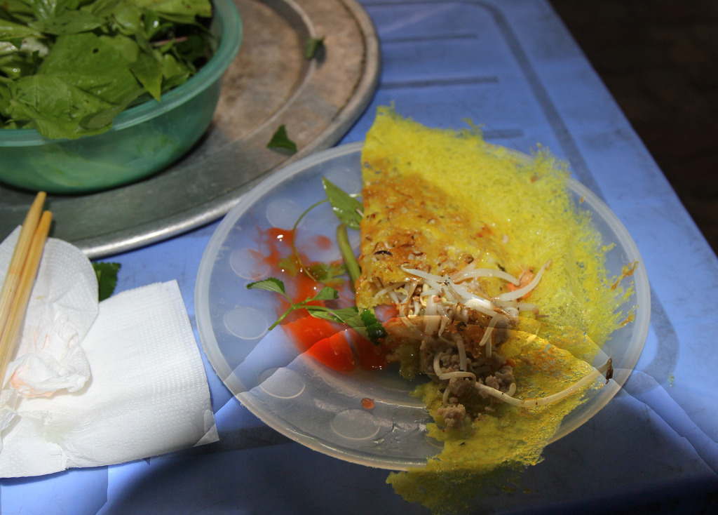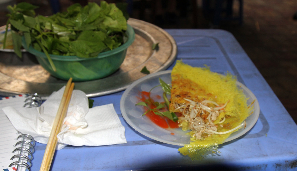 요리하는 모습을 보니 프라이 팬에 노랗게 물들인 묽은 밀가루액 조금 넣고 후라이팬을 돌리니 얇고 둥글게 밀가루 반죽이 익어 누룽지 처럼 되는데 그 속에 닭고기, 세우, 콩나물 등의 양념을 넣고 익힌 후 반으로 접어서 접시에 담아 내준다. 함께 따라 나온 것은 야채 한 접시와 느억맘(베트남식 액젓)이다.