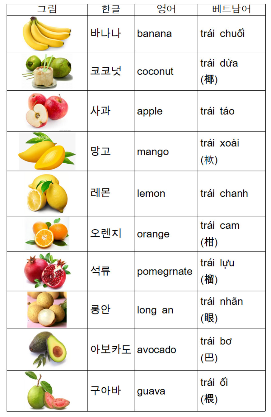 아래 표를 프린트하여 보시면서 위 동영상을 시청하시면 베트남 과일 이름을 익힐 수 있습니다.