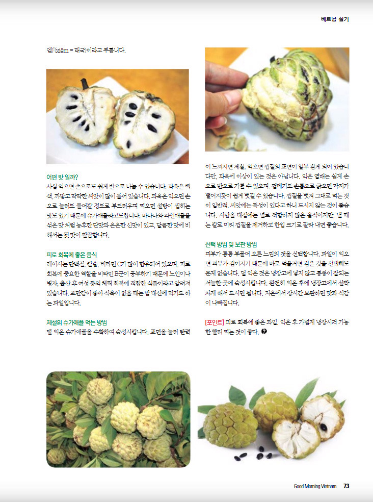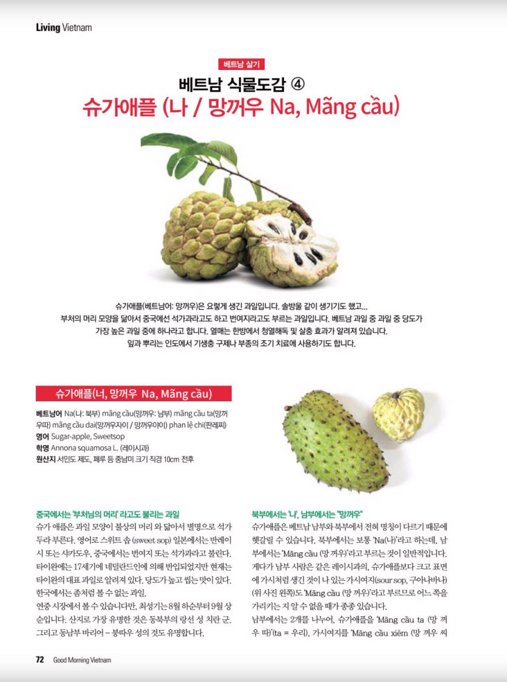 슈가애플은 베트남 남부와 북부에서 전혀 명칭이 다르기 때문에 헷갈릴 수 있습니다. 북부에서는 보동 Na(나)라고 하는데, 남부에서는 Màngcầu(망꺼우)라고 부르는 것이 일반적입니다. 게다가 남부 사람은 같은 래이시과의 슈가애플보다 크고 표면에 가시처럼 생긴 것이 나있는 가시여지(sour sop, 구아나바나) (위 사진 왼쪽)도 mang cầu (망꺼우)라고 부르므로 어느 쪽을 가리키는 지 압수 없을 때가 종종 있습니다.