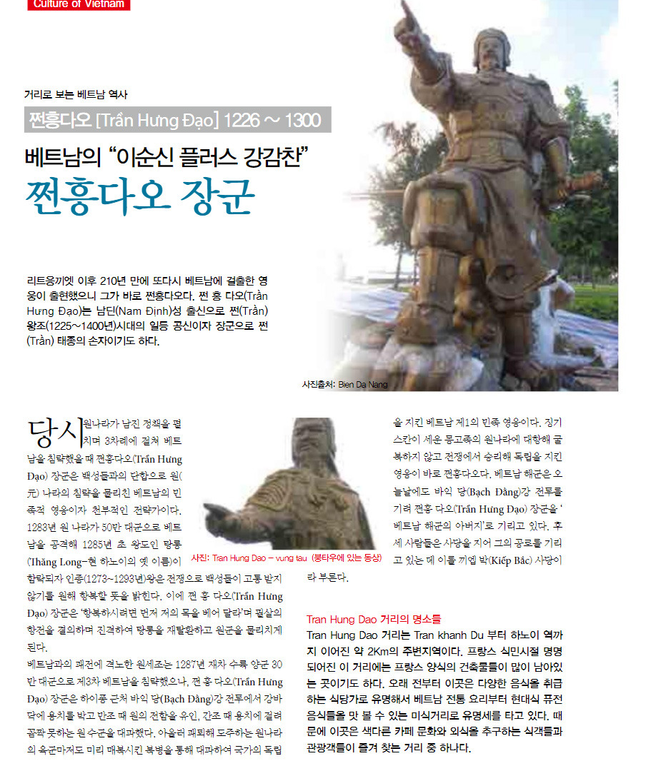리트응끼엣 이후 210년 만에 또다시 베트남에 걸출한 영웅이 출현했으니 그가 바로 쩐흥다오다. 쩐 흥 다오(Trần Hưng Đạo)는 남딘(Nam Định)성 출신으로 쩐(Trần) 왕조(1225~1400년)시대의 일등 공신이자 장군으로 쩐(Trần) 태종의 손자이기도 하다. 당시 원나라가 남진 정책을 펼치며 3차례에 걸쳐 베트남을 침략했을 때 쩐흥다오(Trần Hưng Đạo) 장군은 백성들과의 단합으로 원(元) 나라의 침략을 물리친 베트남의 민족적 영웅이자 천부적인 전략가이다. 1283년 원 나라가 50만 대군으로 베트남을 공격해 1285년 초 왕도인 탕롱(Thăng Long-현 하노이의 옛 이름)이 함락되자 인종(1273~1293년)왕은 전쟁으로 백성들이 고통 받지 않기를 원해 항복할 뜻을 밝힌다. 이에 쩐 흥 다오(Trần Hưng Đạo) 장군은 ‘항복하시려면 먼저 저의 목을 베어 달라’며 필살의 항전을 결의하며 진격하여 탕롱을 재탈환하고 원군을 물리치게 된다.