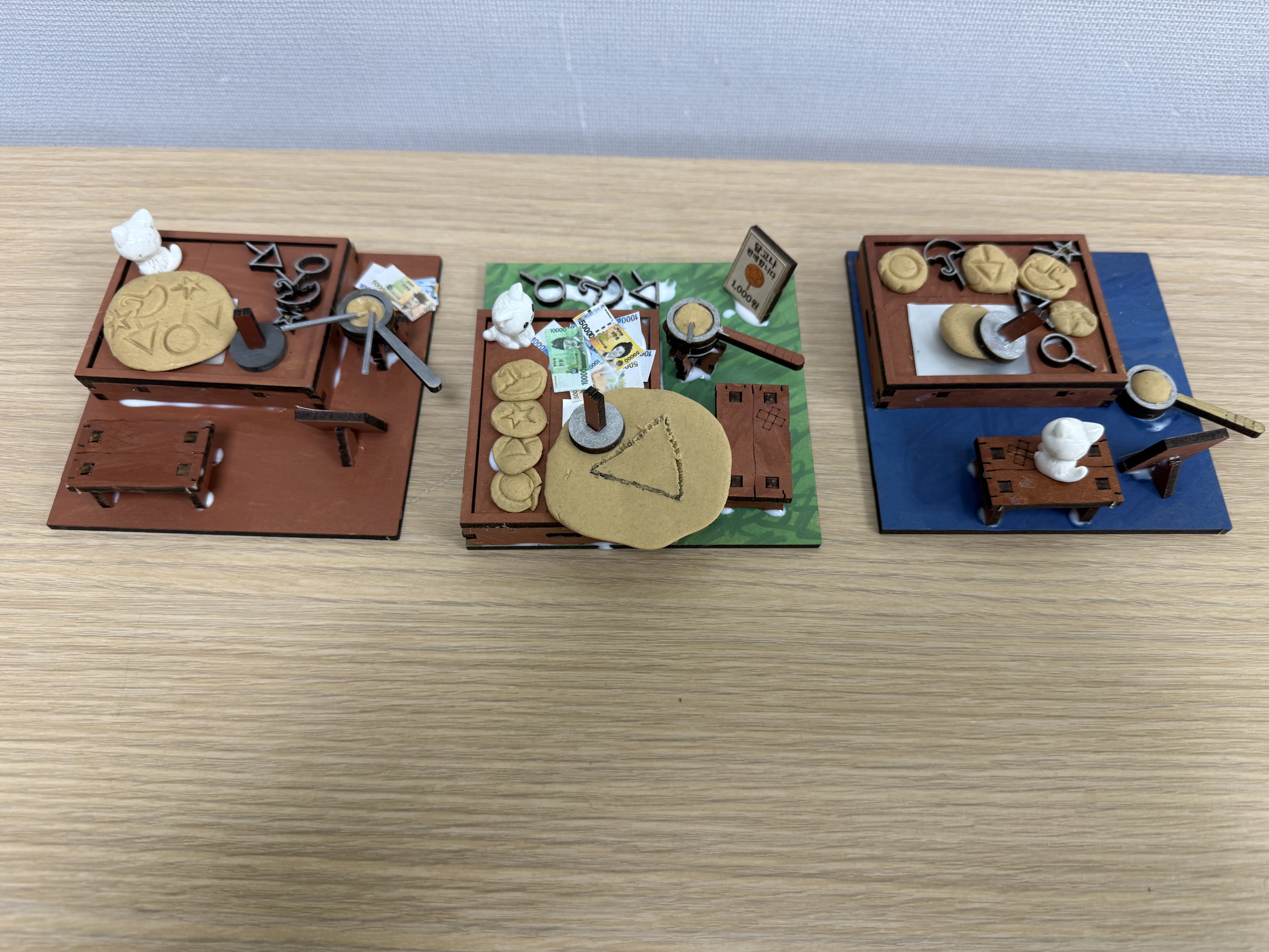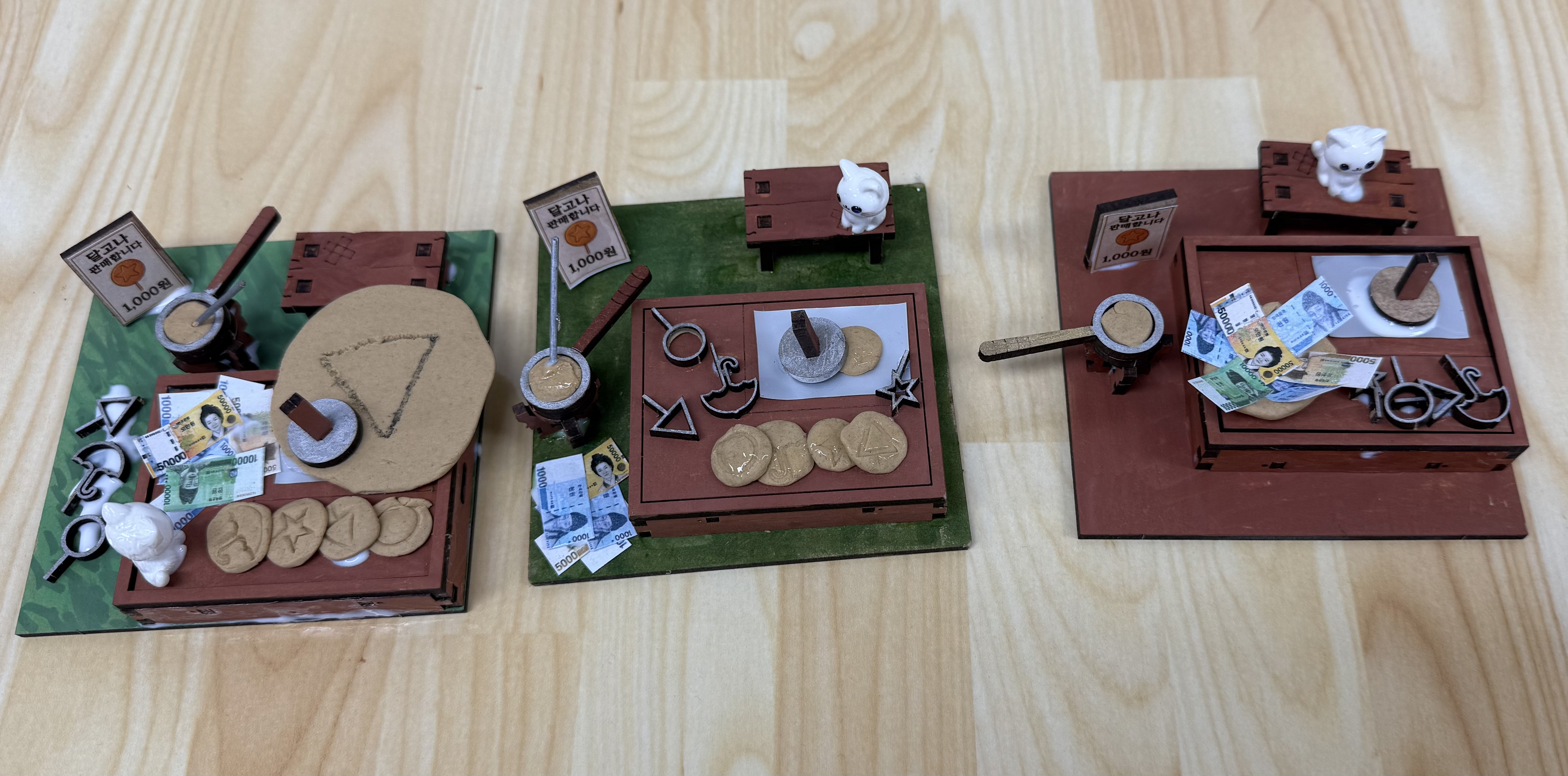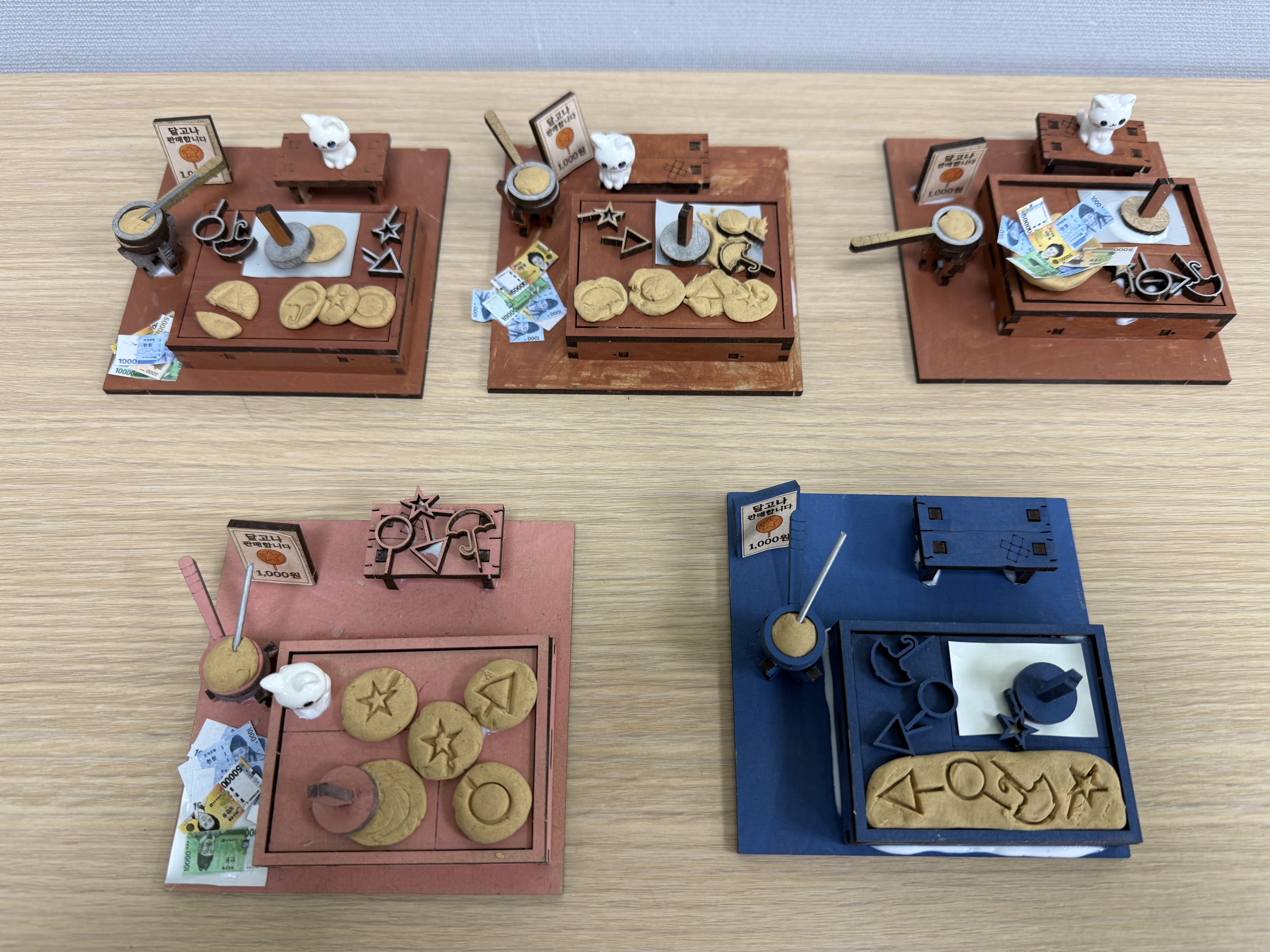 미니어처 사이즈의 간판 포스터와 돈과 피규어를 장식하여 달고나 가게를 완성했습니다.