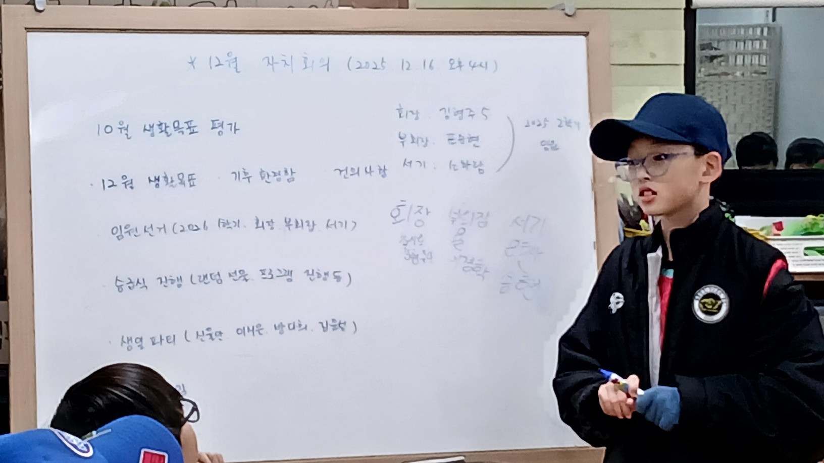 12월 생활목표로 "형에게 바르게 굴기"로 정하고 내년 상반기 임원 선거를 진행하여 화장, 부회장, 서기를 선출 하였습니다.