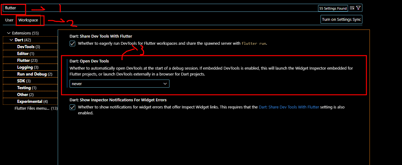 3. Dart: Open Dev Tools 를 Never 로 설정
