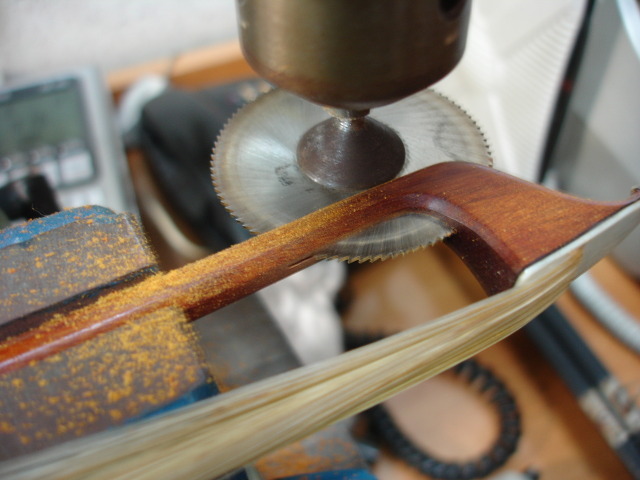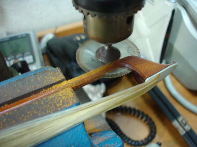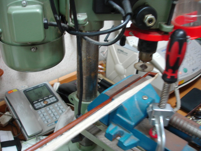 부러진 활은 부러진 후 즉시 순간접착제 401번으로 접착여 놓았습니다. 이것을 게을리 하면 나중에 부러진 면이 정확이 맞지 않을 우려가 있어 빨리 하는 것이 좋습니다. 그런 후 활대를 조이면 접합면이 떨어질 우려가 있어서 활대에 구멍을 뚫어서 심을 박는 수리를 하기도 하나 넓은 면을 접합하는 것이 강한 탄력에도 분리될 우려가 없어 흑단을 얇게 하여 사이에 끼우고 접합합니다.