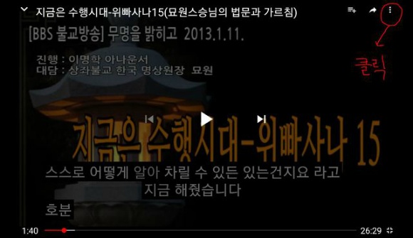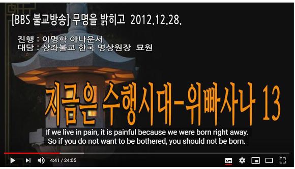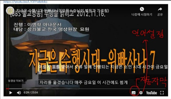 구글의 유튜브에서는 그 나라 언어에 맞는 자동 자막을 제시하는데 자막을 보시려면 아래 'cc' 부분을 클릭하시면 됩니다. 각 나라 언어로 자동 번역도 가능합니다. 한국말이지만 영어로 번역되어 자막이 보여집니다.