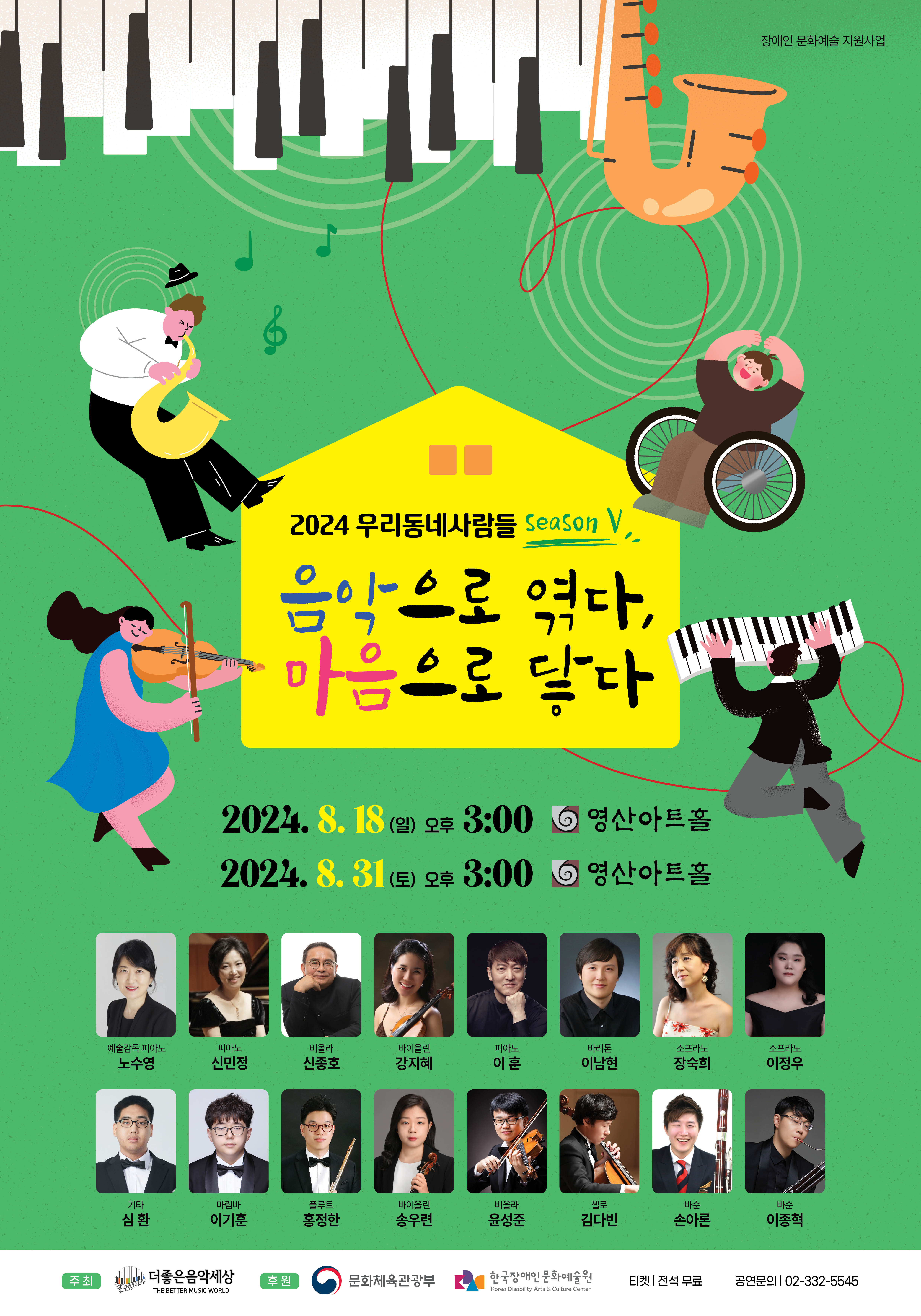 더좋은음악세상 활동 취지에 따라 “우리들의 사람들”이라는 시리즈 공연을 개발하였으며, 2019 시즌1 ‘젊은 예술가의 이야기’, 2020 시즌2 언택트 공연 ‘안녕, 나의 이웃’, 2021 시즌3 ‘행복한 동행’, 그리고 2023년 시즌4 “회복, 그리고 희망속으로”라는 제목으로 공연을 함께 했습니다. 올해2024년에는 시즌5 “음악으로 엮다, 마음으로 닿다”라는 주제로, 온전히 음악을 통하여 각자의 다른 삶을 이해하고 공감하여 열린 마음을 경험하는 시간을 준비했습니다. 오늘 저희 무대의 음악이 여러분 모두의 마음에 닿아 큰 위로와 희망을 가지는 뜻깊은 시간이 되시길 바랍니다. 감사합니다.
