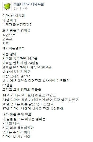 해당 학생은 "참 이상해. 왜 엄마가 수저가 돼버린걸까?"라며 "왜 사람들은 엄마를 직업으로 평수로 차로 얘기하는 걸까"라고 적었다.