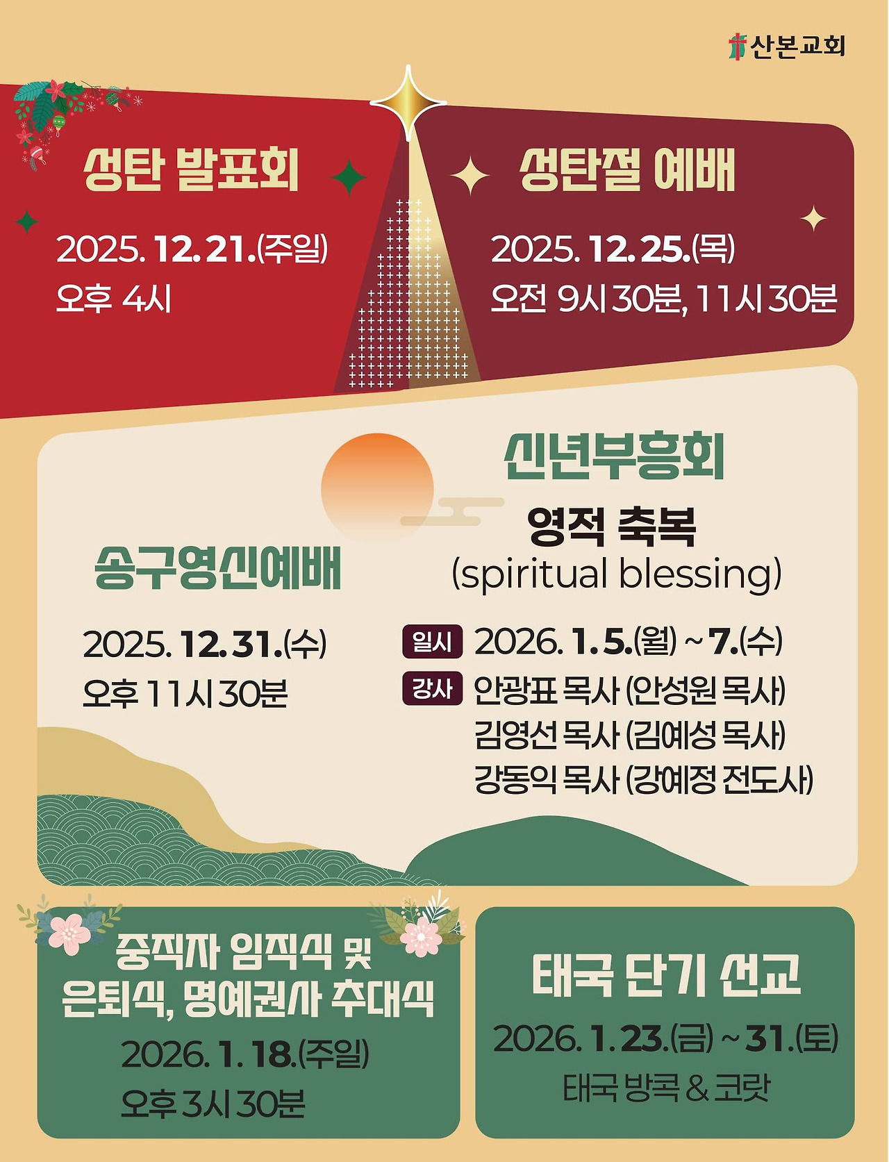 이번 부흥회는 좀 특별합니다. 첫 날은 손자인 안성원목사님과 할아버지인 안광표선교사님이 말씀을 전해 주십니다. 안광표선교사님은 선교사 · 한인 사회 · 현지 교회를 잇는 다리 역할을 감당해 온 선교사님입니다. 고등학교 시절 선교의 부르심을 받고 몽골로 가서 디아스포라 한인교회의 선교적 모델을 세웠고, 몽골연합신학대학 이사장으로 종신교수로 섬기며 현지 목회자와 신학생들을 세우는 일에도 헌신했습니다. 둘째 날은 사위인 김예성목사님과 장모님인 김영선 목사님입니다. 목사님은 "신앙공동체, 교육공동체, 생활공동체" 비전을 갖고, 지역사회의 소외된 이들을 돌보며 인천 계양산 자락의 해인교회를 섬기고 있습니다. 셋째 날은 딸인 강예정전도사님과 아버지인 강동익목사님께서 말씀을 전해 주십니다. 강동익 목사님은 작은자리, 소외된 자, 한 영혼을 위한 목회와 목양을 꿈꾸며 담임목회를 하며 동시에 세상에서 그리스도의 향기를 전하기 위해 사회복지를 겸하였습니다. 어디에서나 누구도 눈길을 주지 않는 한 영혼에 대한 갈급함으로 지금까지 맡겨진 사명을 감당하고 있다. 소개를 들으시면 아시겠지만신년부흥회는 특별한 시간들입니다. 손자와 할아버지, 사위와 장모님, 딸과 아버지의 신년부흥회를 통해 영적 축복의 전수가 일어나기를 기대합니다. -> 이번 부흥회 헌금은 문화센터를 위해서 사용될 것입니다. 오랜 기간 기도해 왔던 다음세대를 섬기고 지역사회를 품고 섬기는 복합문화센터 리모델링을 통해서 산본교회가 말로만 다음 세대를 사랑하는 것이 아니라 실제적으로 사랑하는 것을 보여주기를 원합니다.