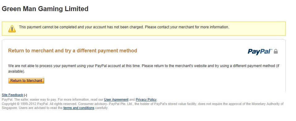 우린 현재 당신의 페이팔 계정을 사용하여 결제를 진행할 수 없습니다. 판매자 웹사이트(그린맨게이밍)로 돌아가서 다른 결제방식(가능하다면)으로 결제를 시도하십시오. -
