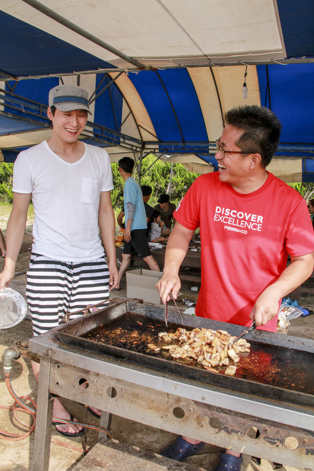 8월 8일. 곽지 해수욕장. 우리나라 4대 해수욕장중의 하나다. 해안에서 솟는 민물 즉 '과물노천탕‘으로 유명한 그곳에서 하나테니스클럽 회원 30여명을 만났다. 가족 동반한 회원들의 야유회 현장이다. 한쪽에서는 토종 흑돼지가 숯불위에서 후각을 자극하며 익어가고 커다란 평상에는 전복 소라등 갖은 보양제를 넣은 백숙과 준비된 음식들이 화려하다. 잘 차려진 음식을 보니 이것은 단순한 야유회가 아니라 잔칫집 같다.