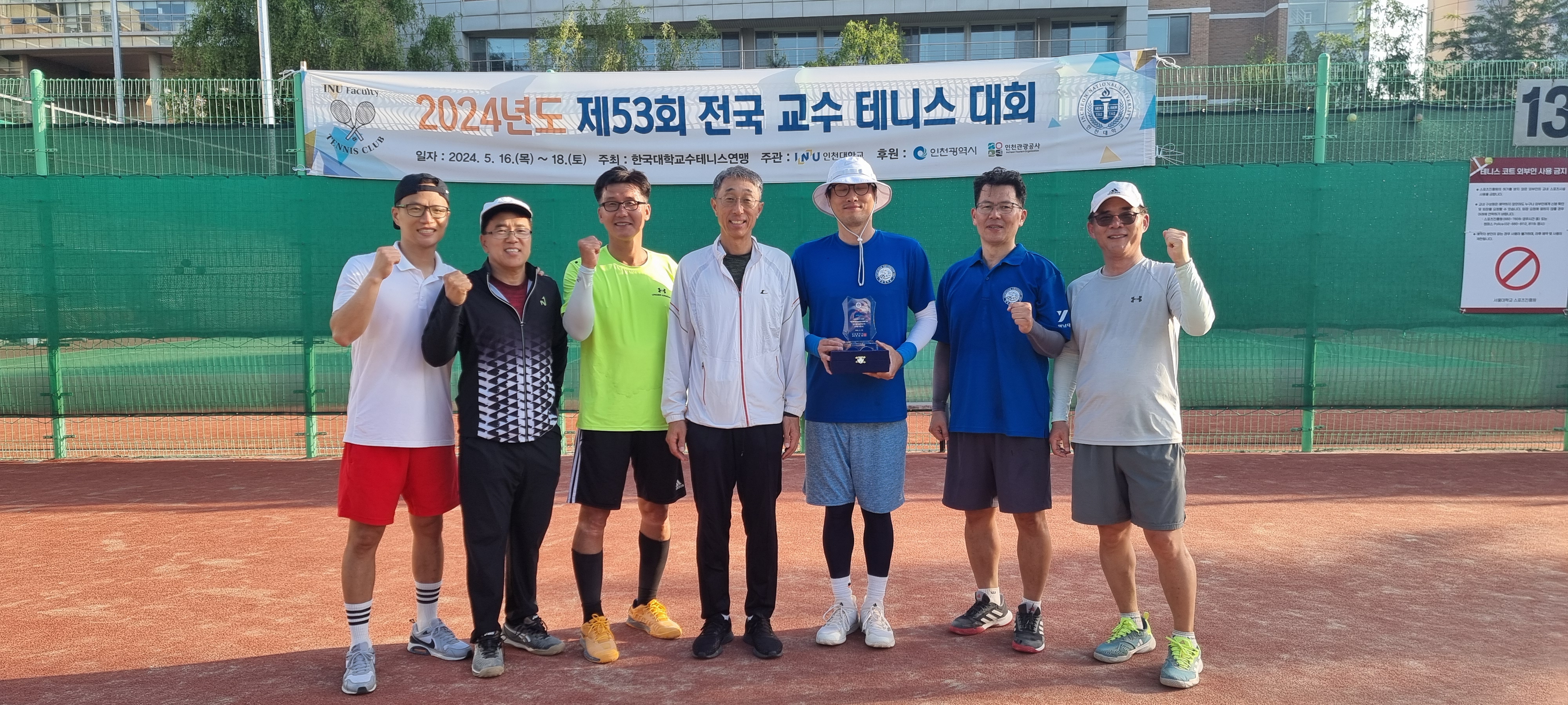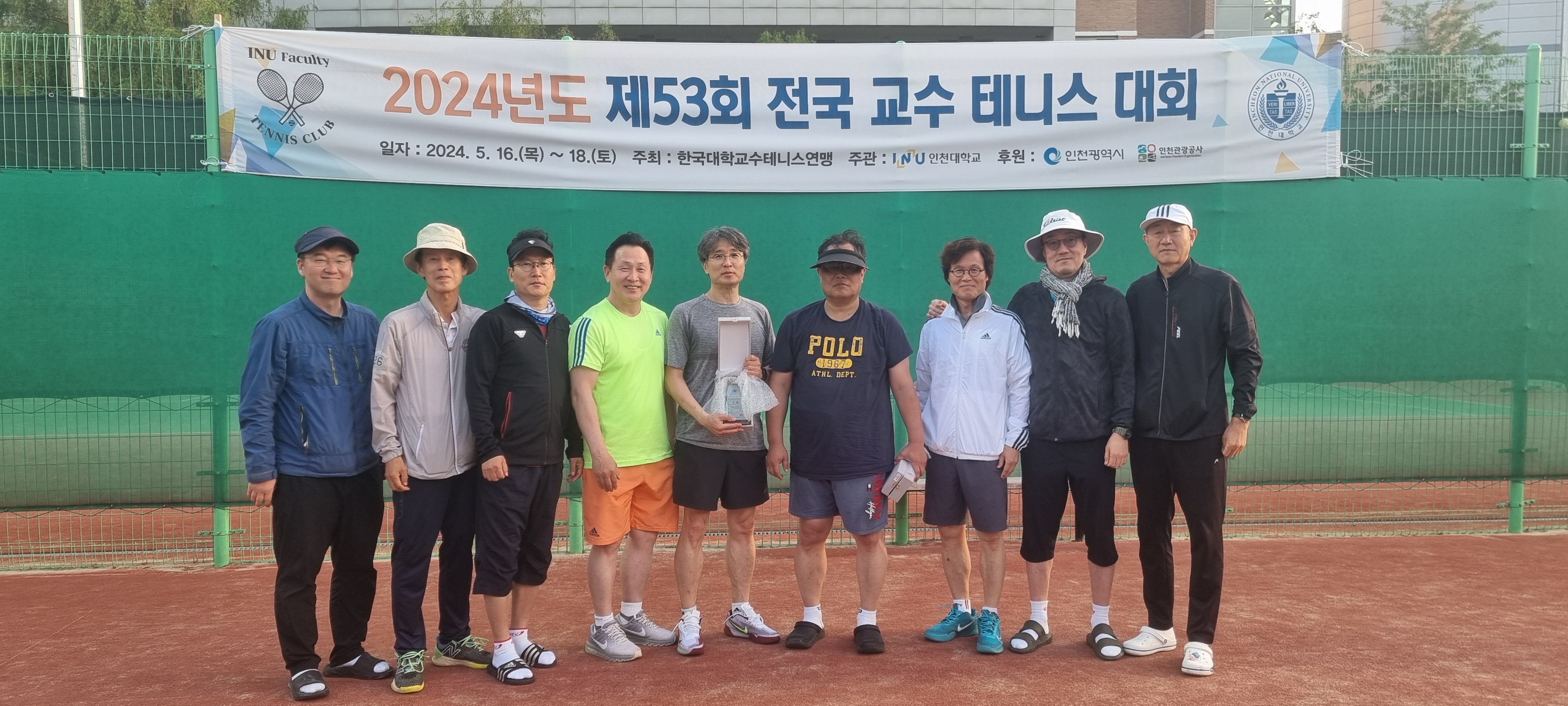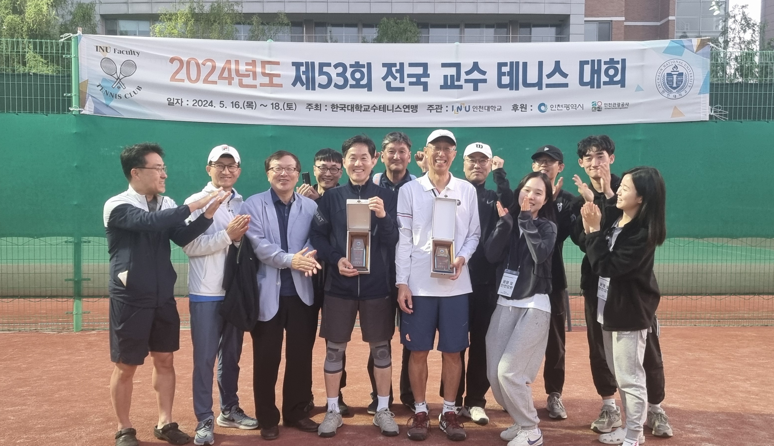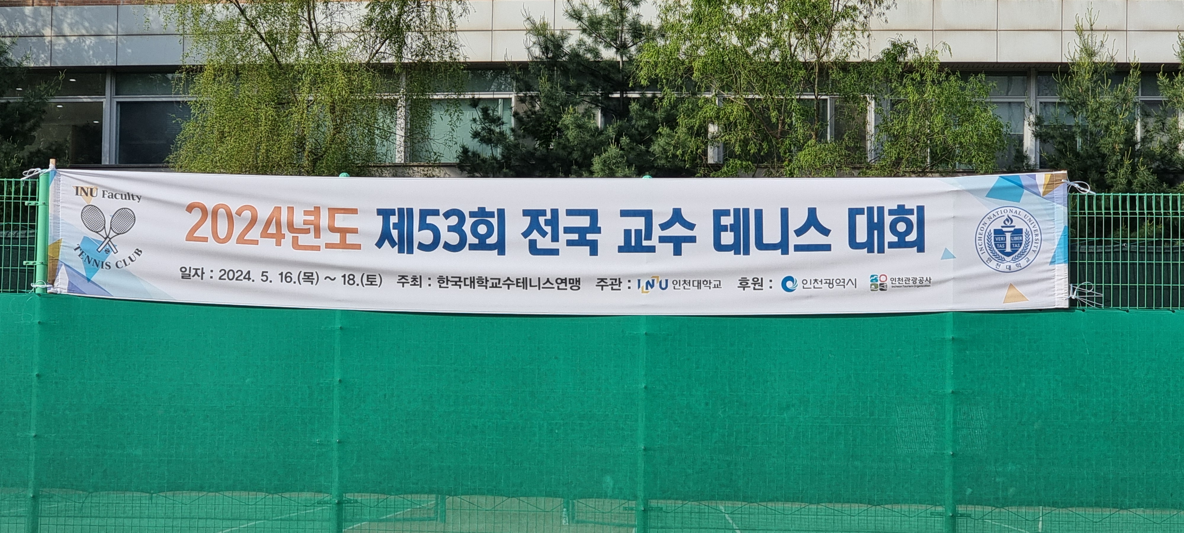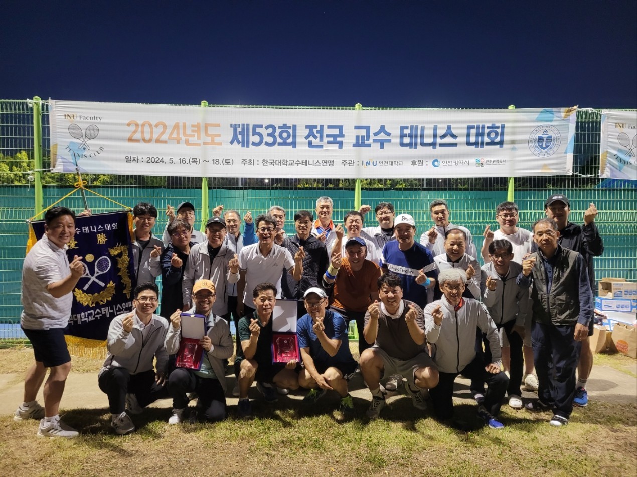 2024년 제53회 전국교수테니스대회가 5월 17일~ 18일 양 이틀에 걸쳐 인천대학교를 비롯해 인천 \열우물 경기장과 송도달빛코트, 인천시립가좌테니스장, 서울대학교 코트등 9군데로 분산되어 총 85개 코트를 사용하여 개최 되었다. 전국의 85개 대학 1308 명이 참석한 이 대회는 첫날 개인전을 시작으로 청년부와 일반부, 장년부와 시니어부 그리고 여성부까지 총 12개 부서로 세분화하여 치러졌다.
