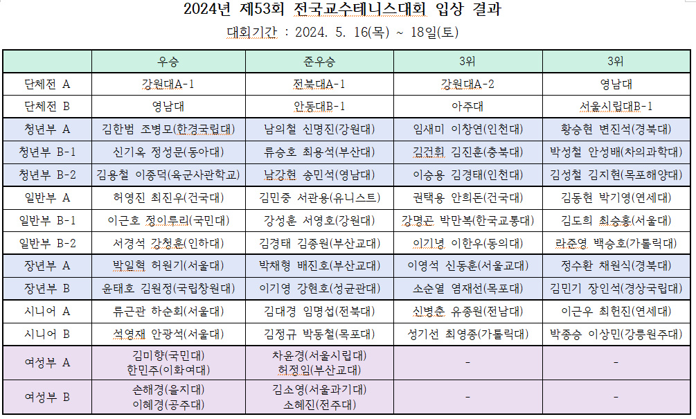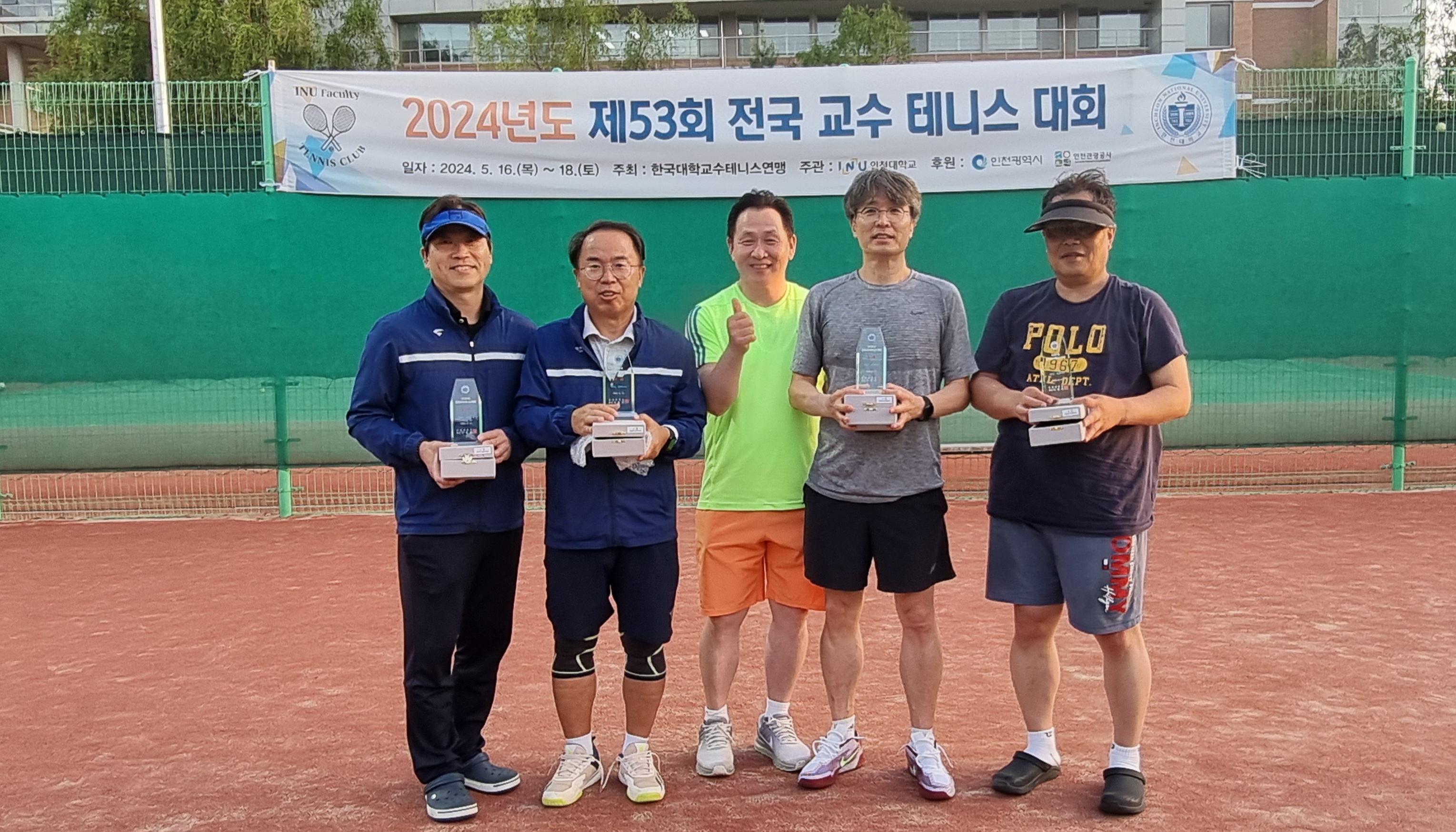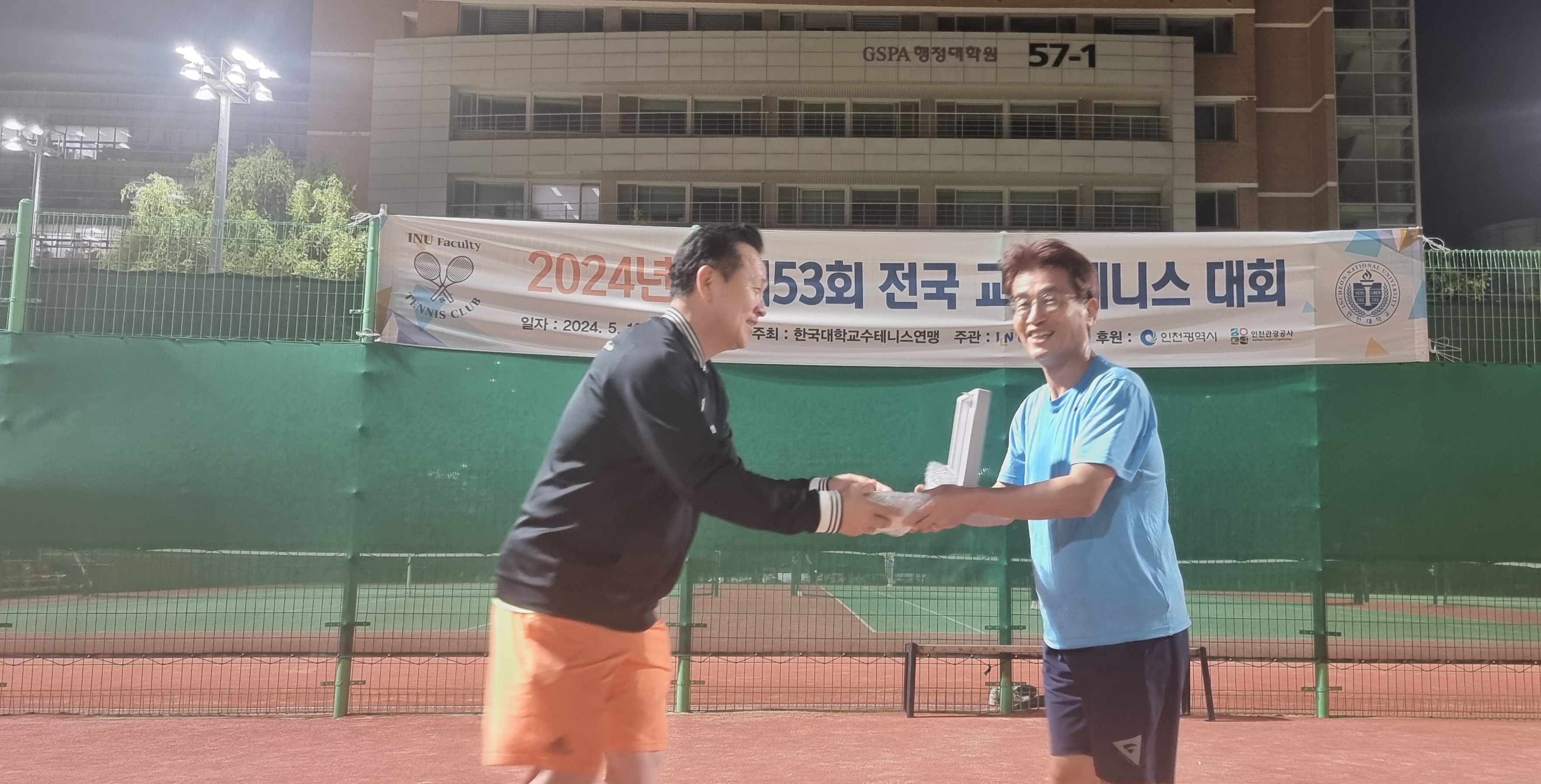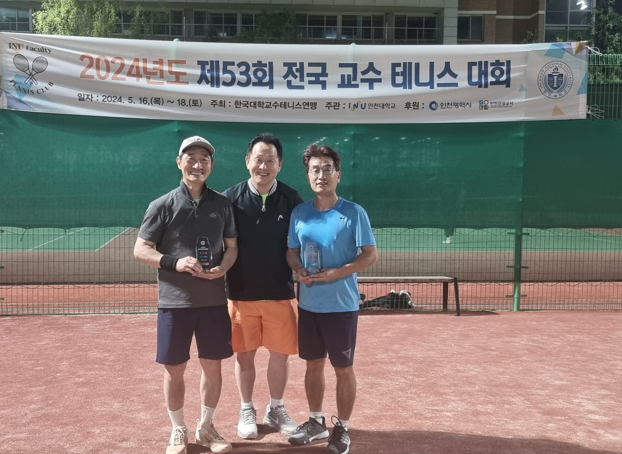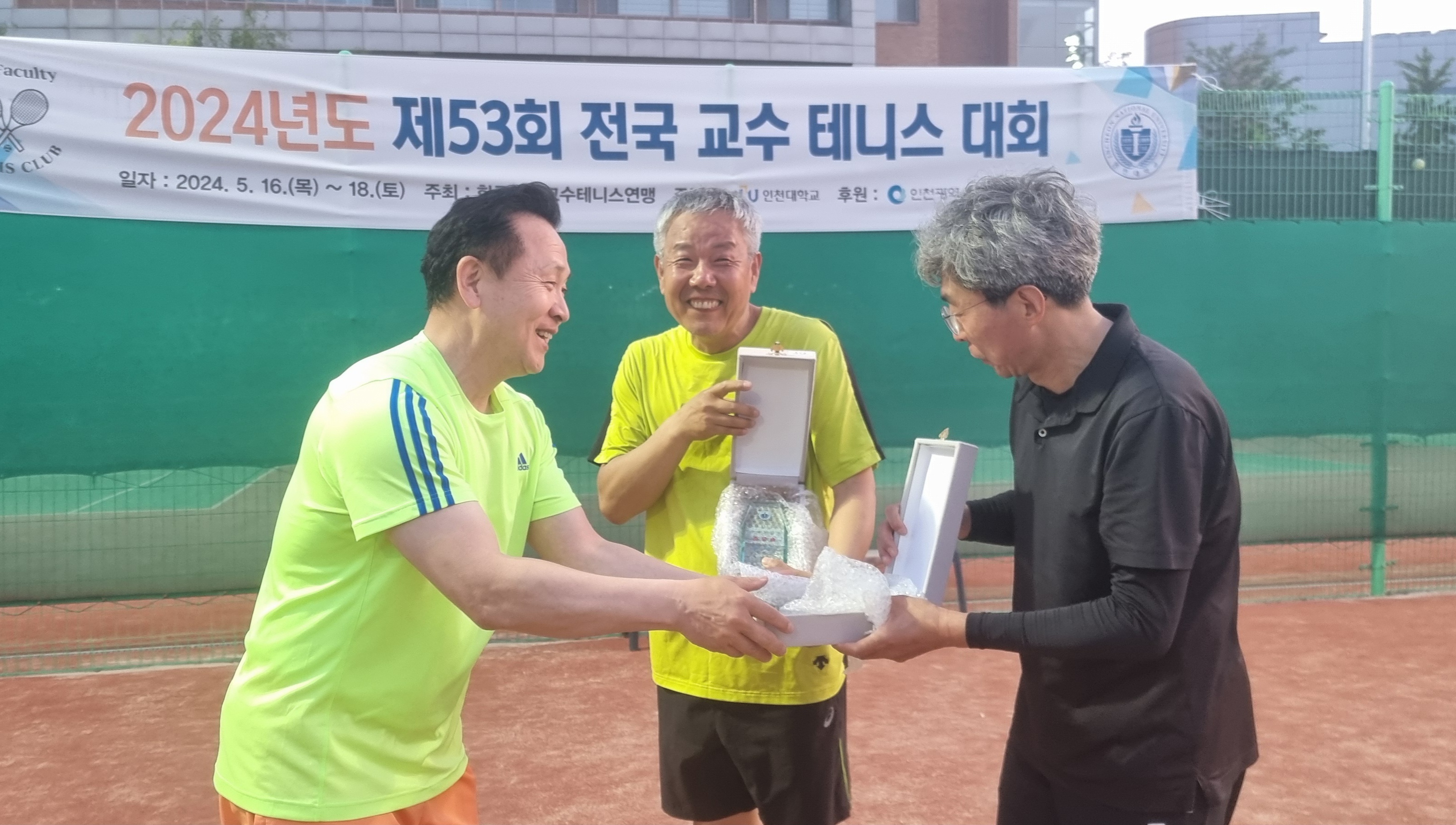 2024년 제53회 전국교수테니스대회가 5월 17일~ 18일 양 이틀에 걸쳐 인천대학교를 비롯해 인천 \열우물 경기장과 송도달빛코트, 인천시립가좌테니스장, 서울대학교 코트등 9군데로 분산되어 총 85개 코트를 사용하여 개최 되었다. 전국의 85개 대학 1308 명이 참석한 이 대회는 첫날 개인전을 시작으로 청년부와 일반부, 장년부와 시니어부 그리고 여성부까지 총 12개 부서로 세분화하여 치러졌다.