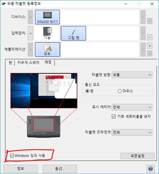 이런경우는 제어판의 와콤 타블렛 등록정보> 매핑에서