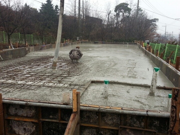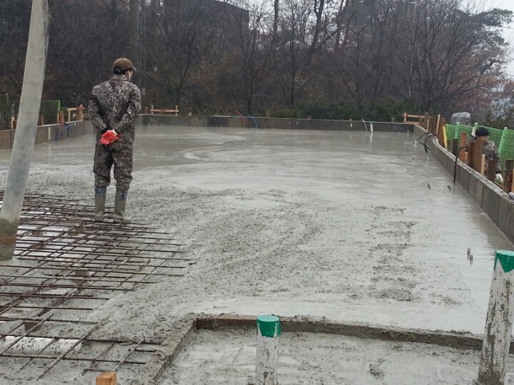 화성 신남리 1층 52평 바닥 기초후 콘크리트 타설하는 장면