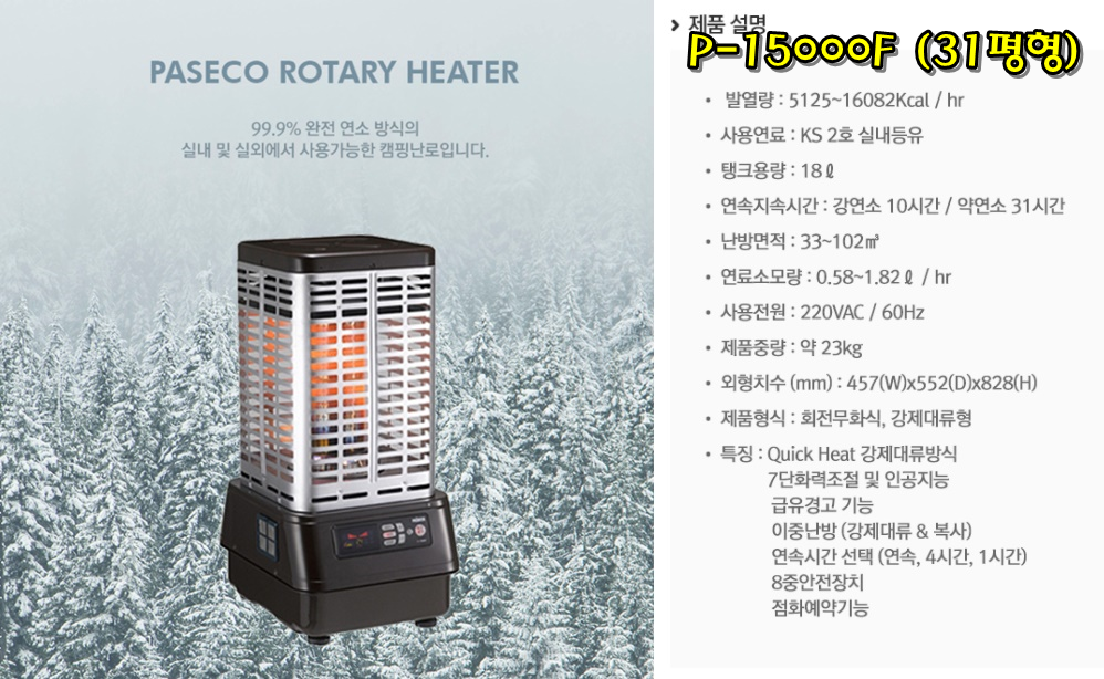 고화력 강력버너 사용/다양한 안전장치/자동조절기능/리모콘기능 등이 있어 편리하고 안전하게 사용하실수 있는 난방기 제품입니다.