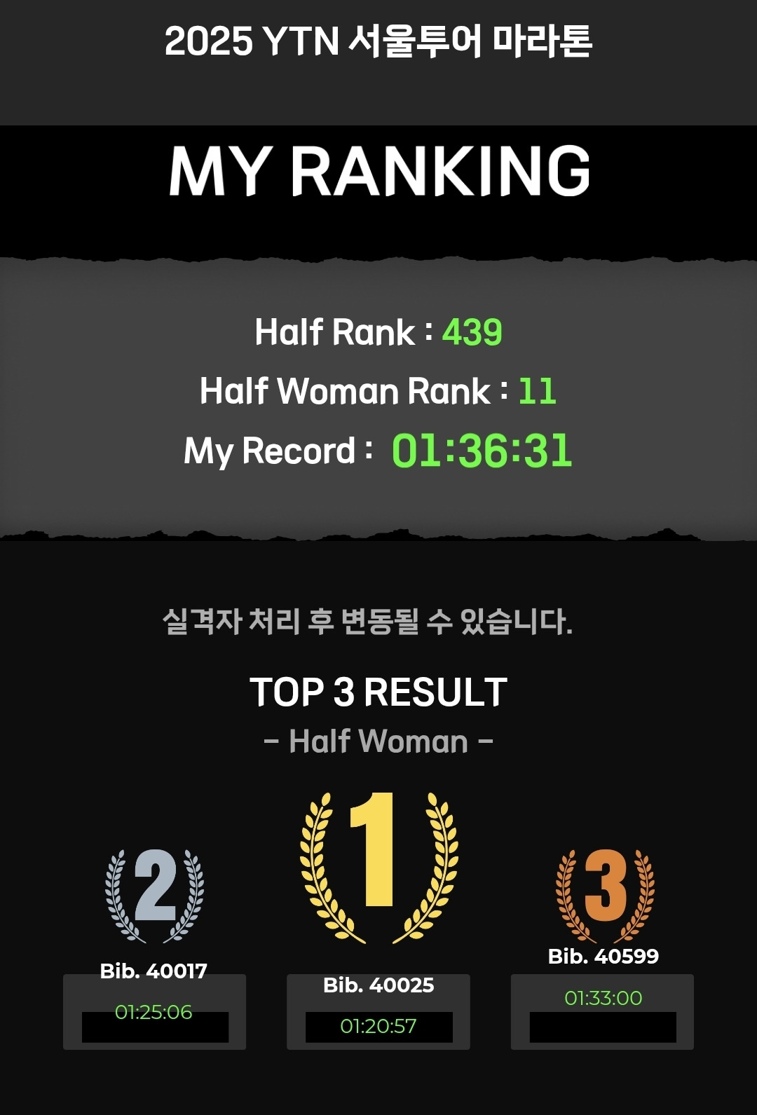 △ 하프 코스 참가한 홍은녀 님 여자 11위
