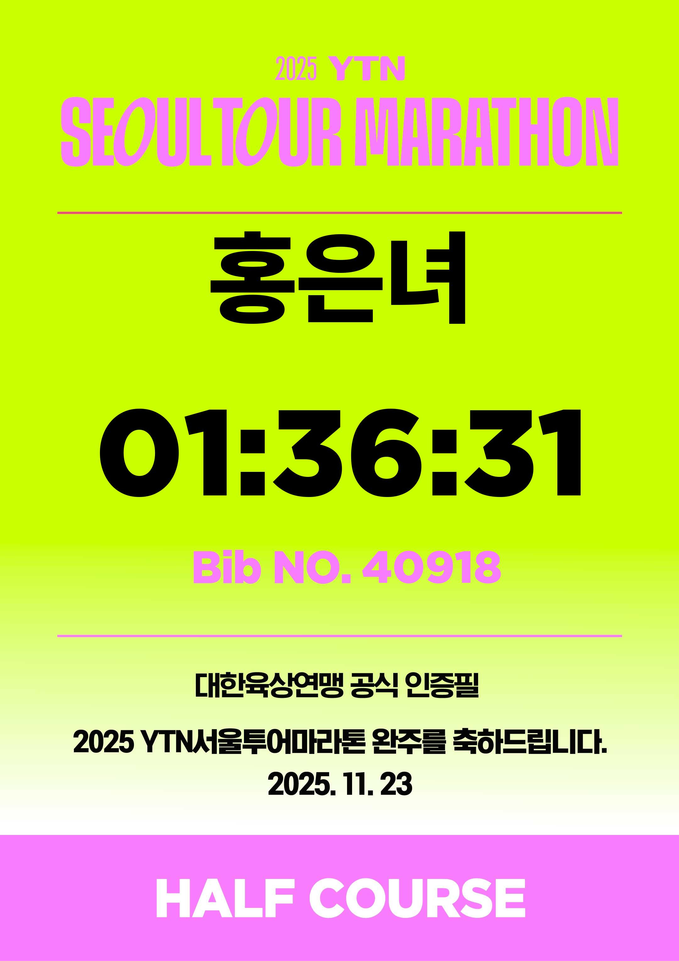 △ 홍은녀 님 하프 기록 : 1시간 36분 31초 PB 달성