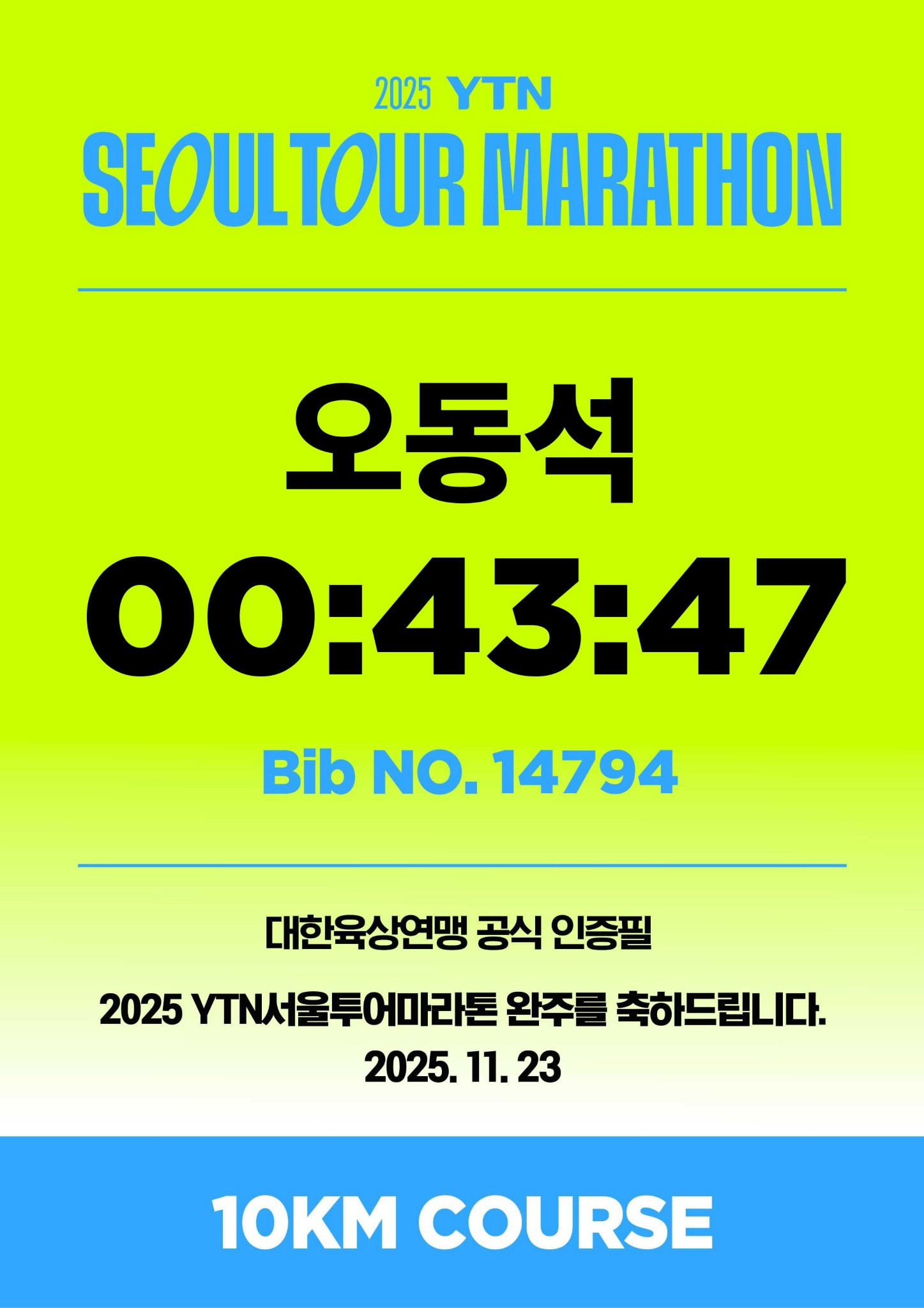 △ 오동석 님 10km 기록 : 43분 47초 PB 달성