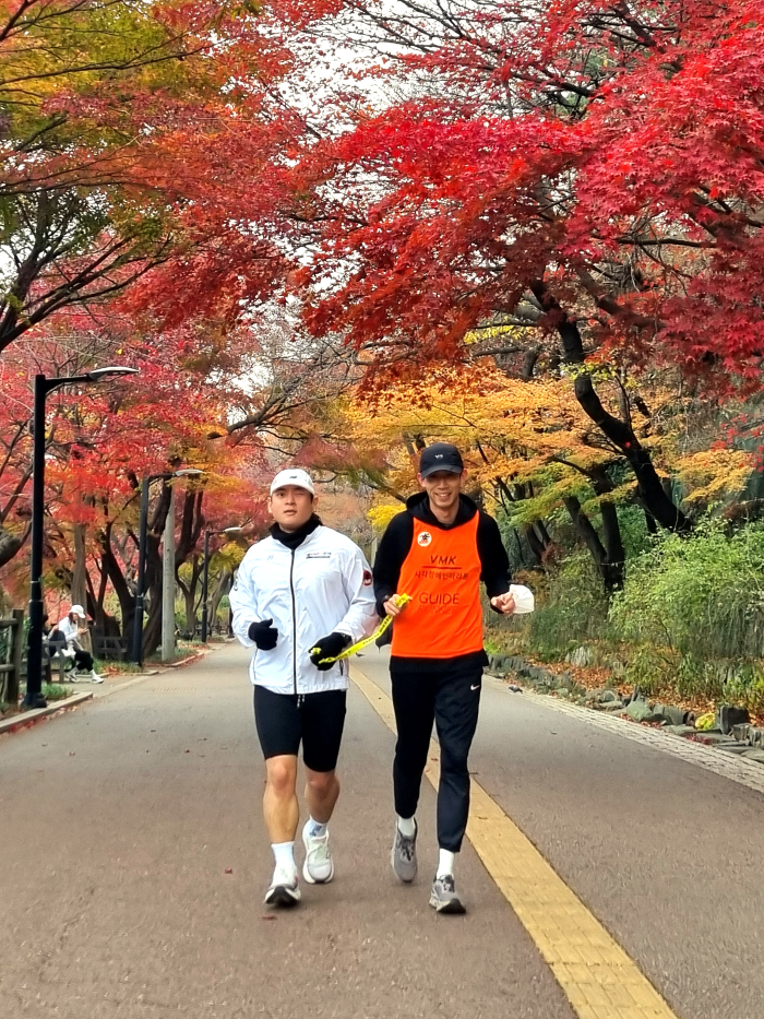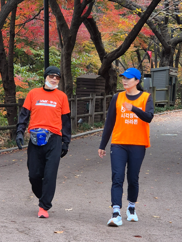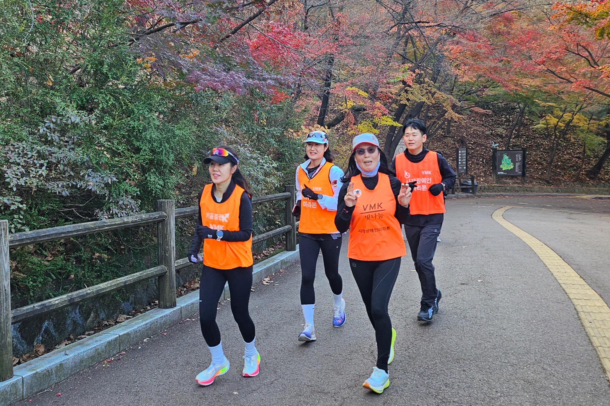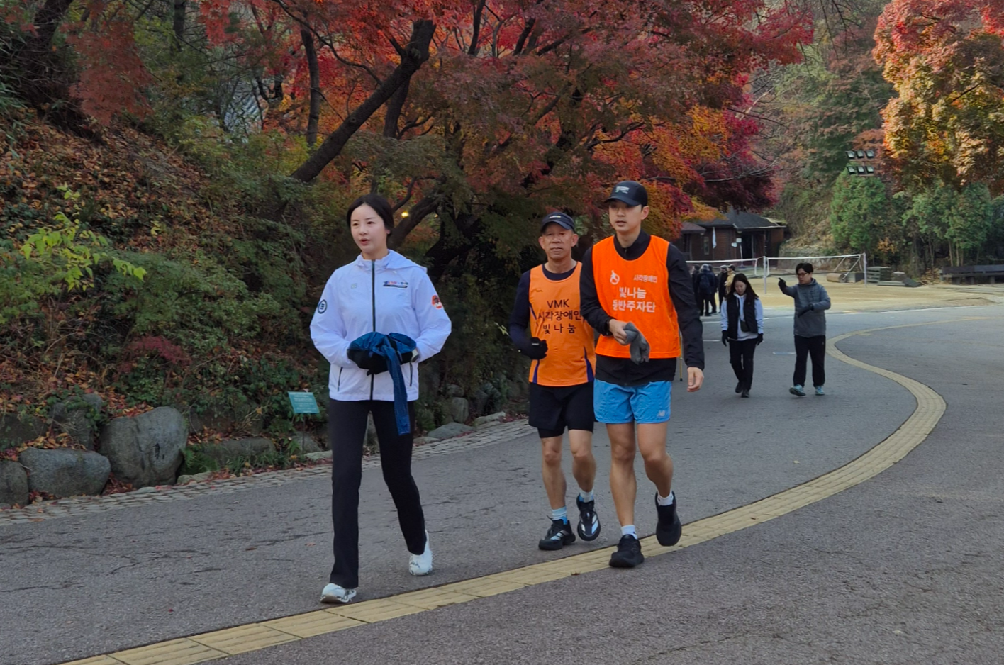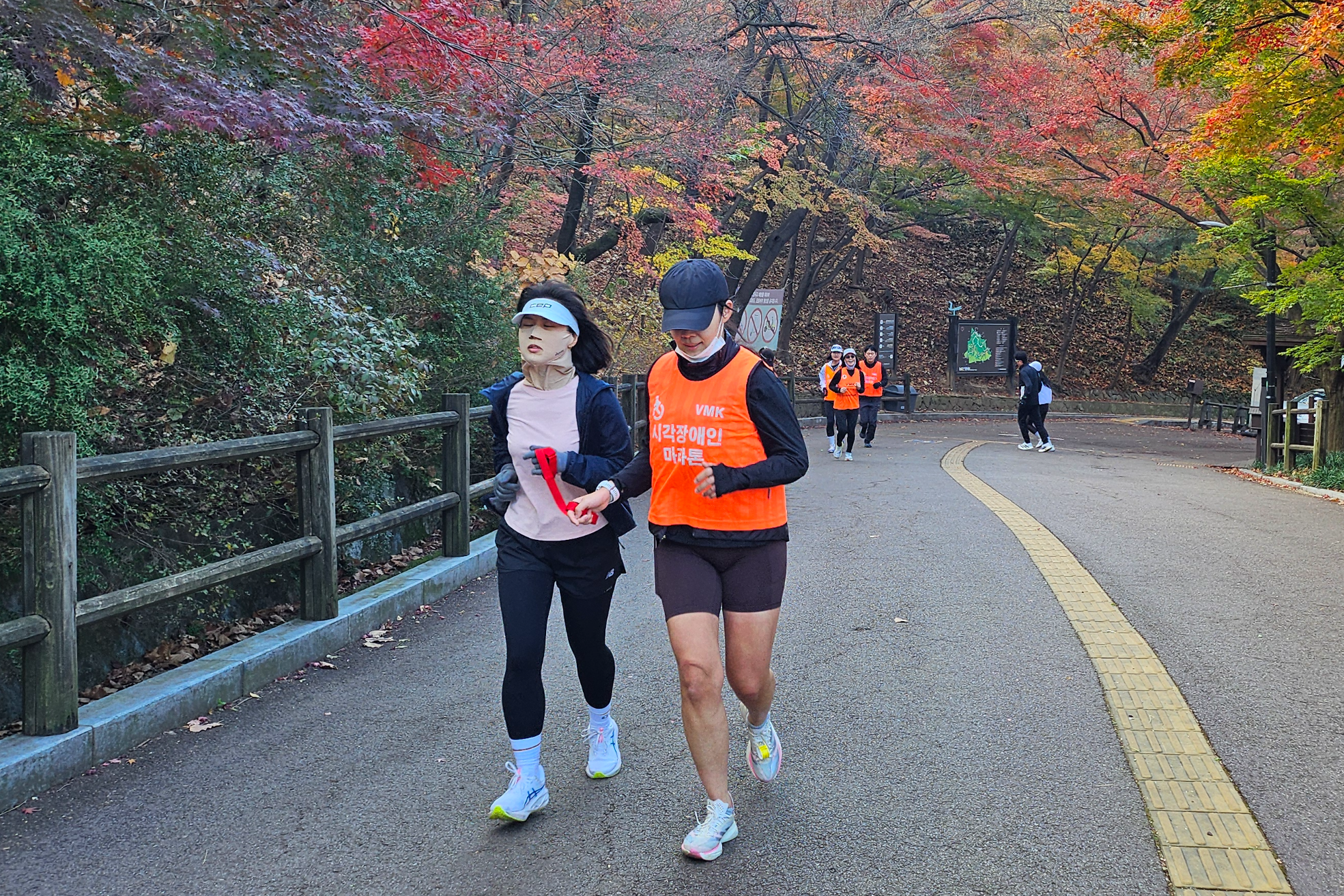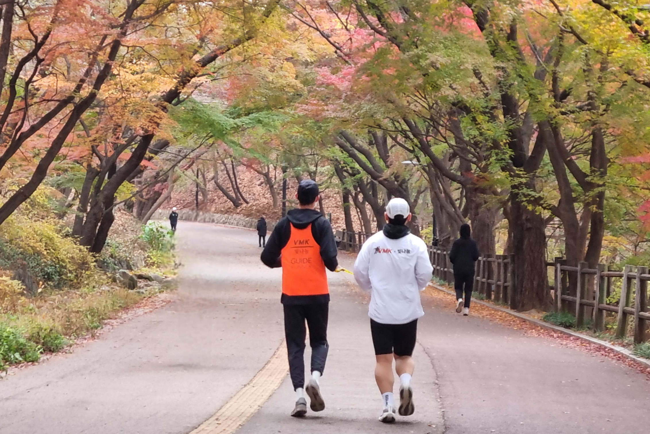 2025년 11월 22일(토) 오전 9시, 서울시 중구 남산 북측순환로에서 한국시각장애인마라톤회(VMK) 정기 훈련과 빛나눔 동반주자 신입 단원을 위한 가이드 러너 교육이 진행됐습니다.
