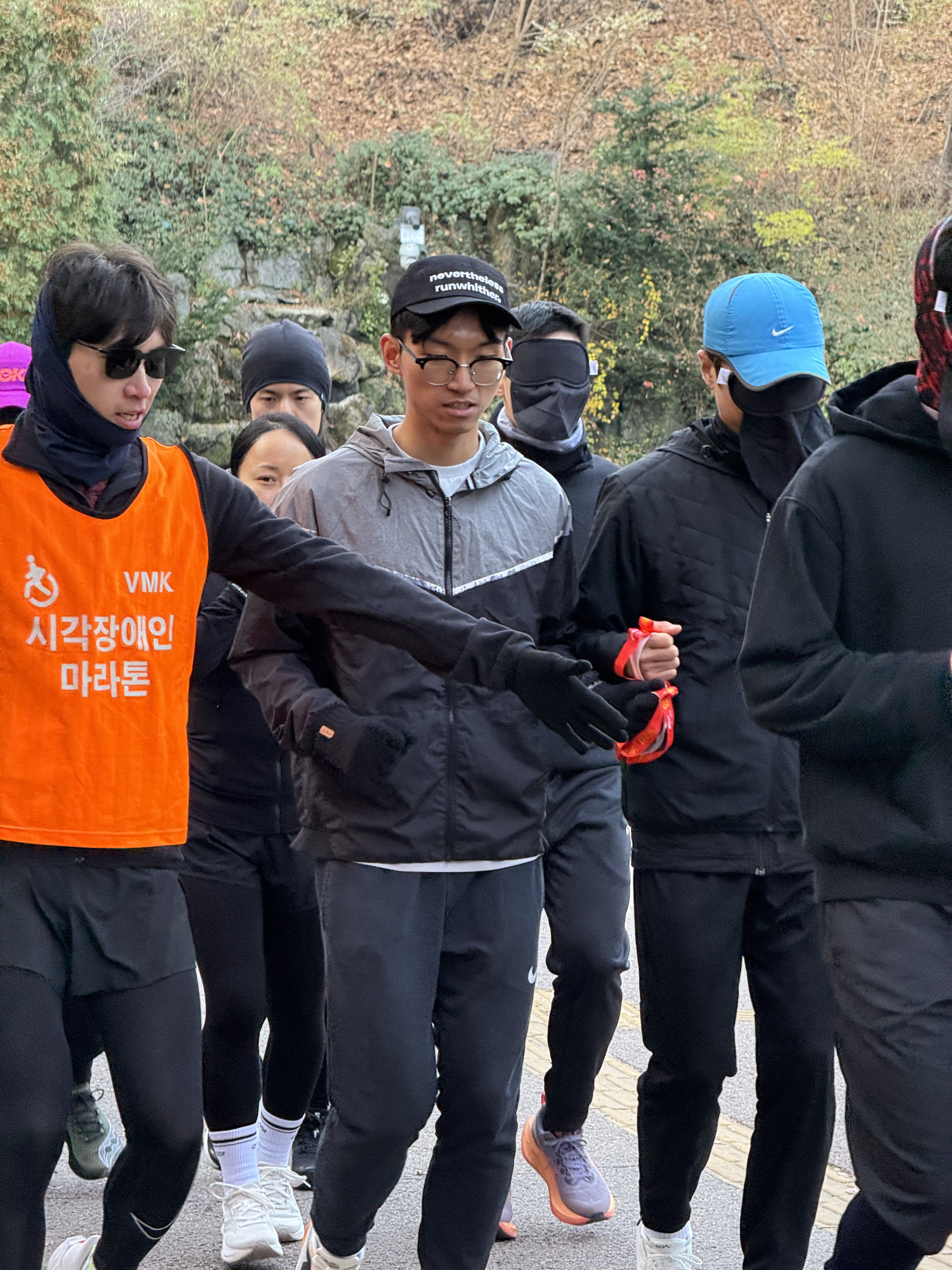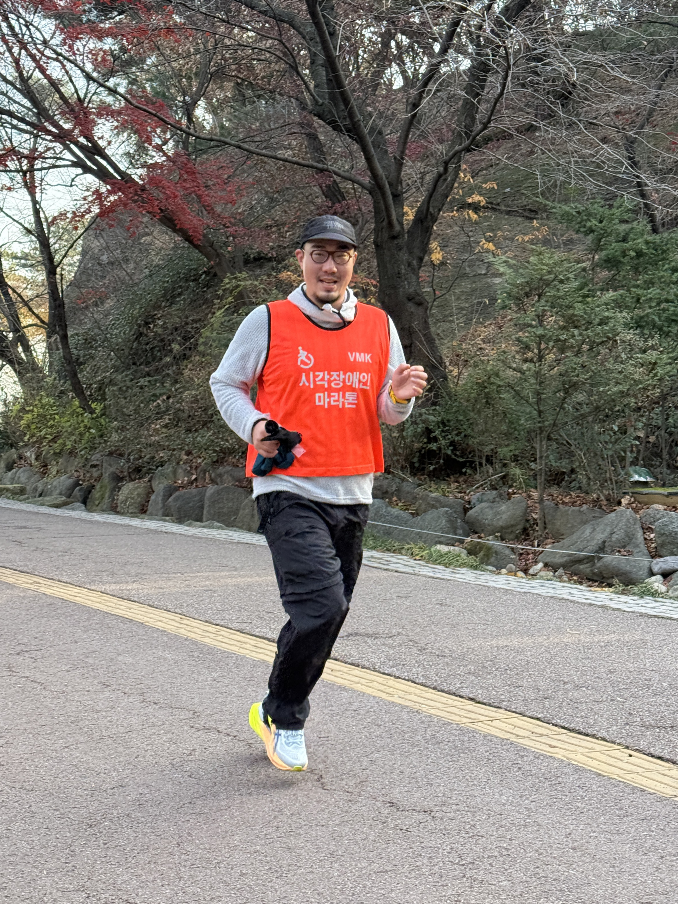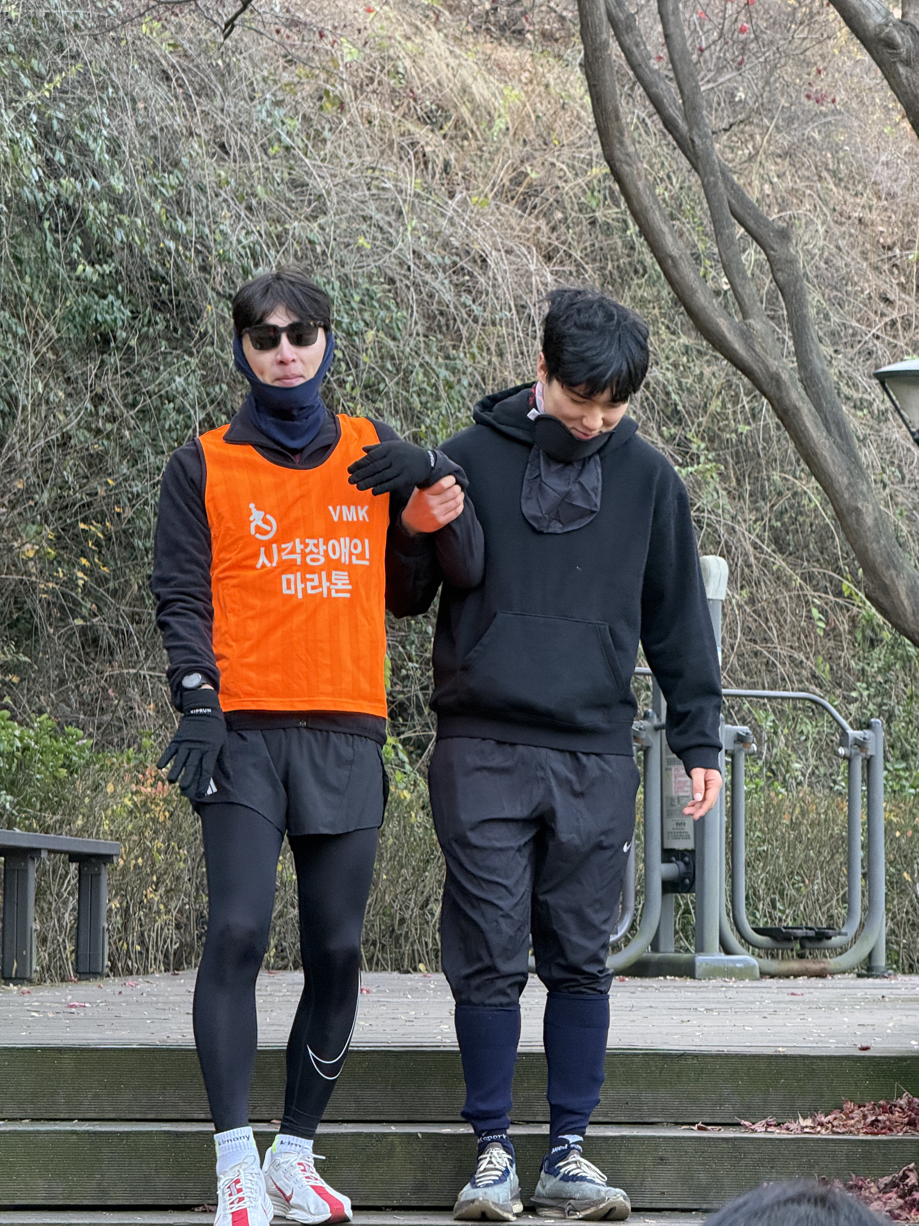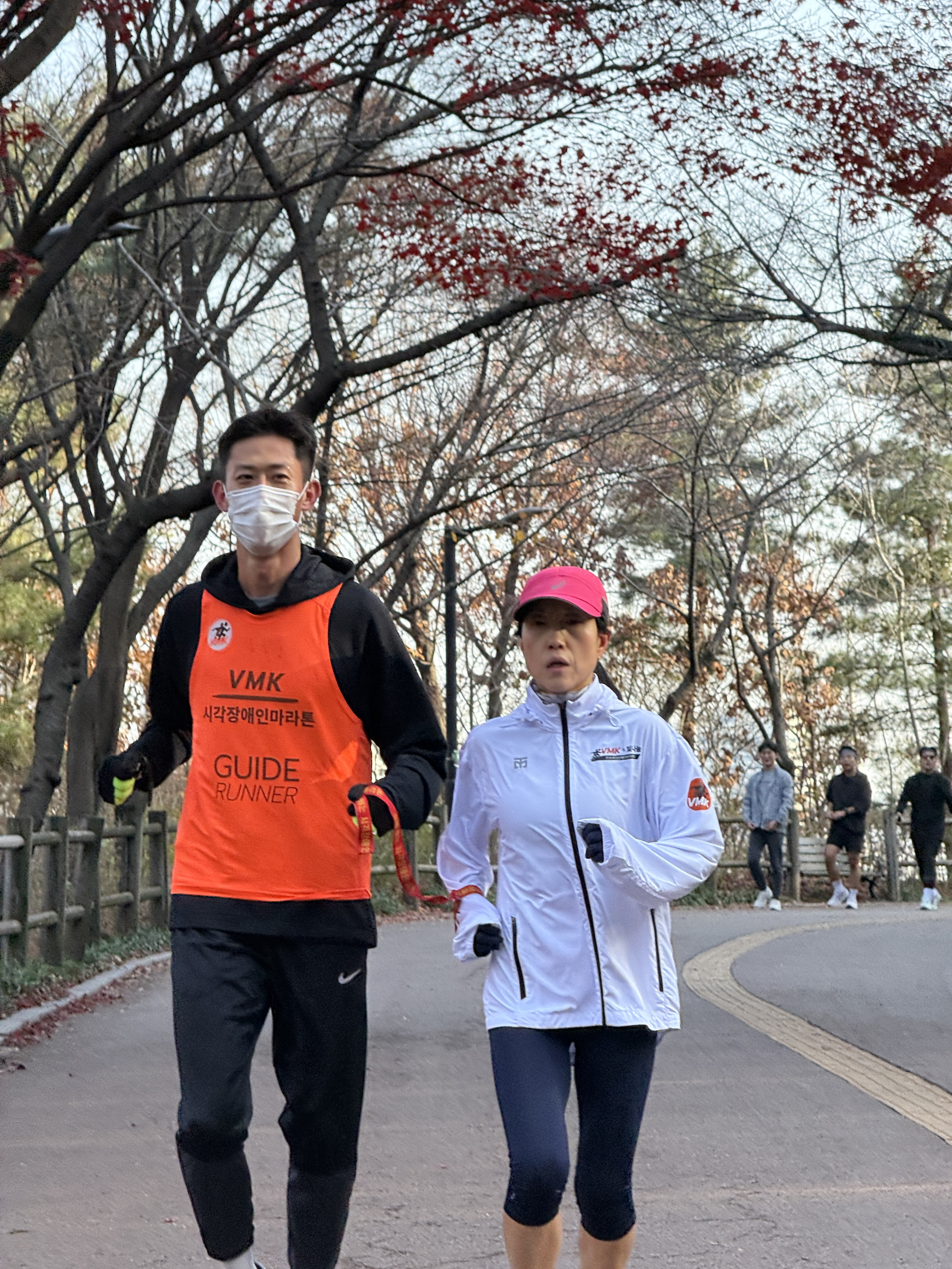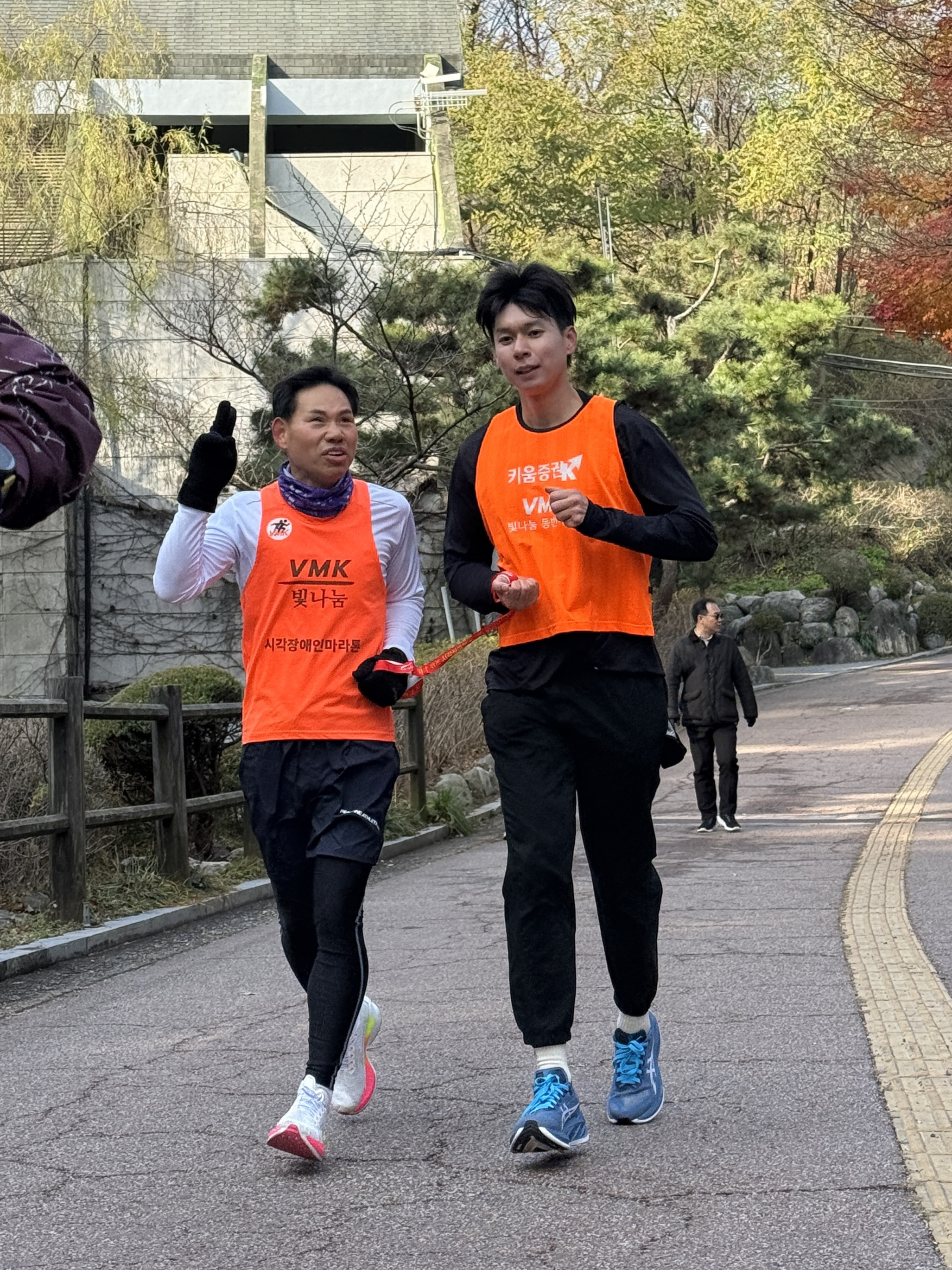 2025년 11월 29일 토요일 오전 9시, 서울 남산 북측순환로에서 진행된 한국시각장애인마라톤회(VMK) 정기 훈련과 가이드 러너 교육 사진입니다.11·29