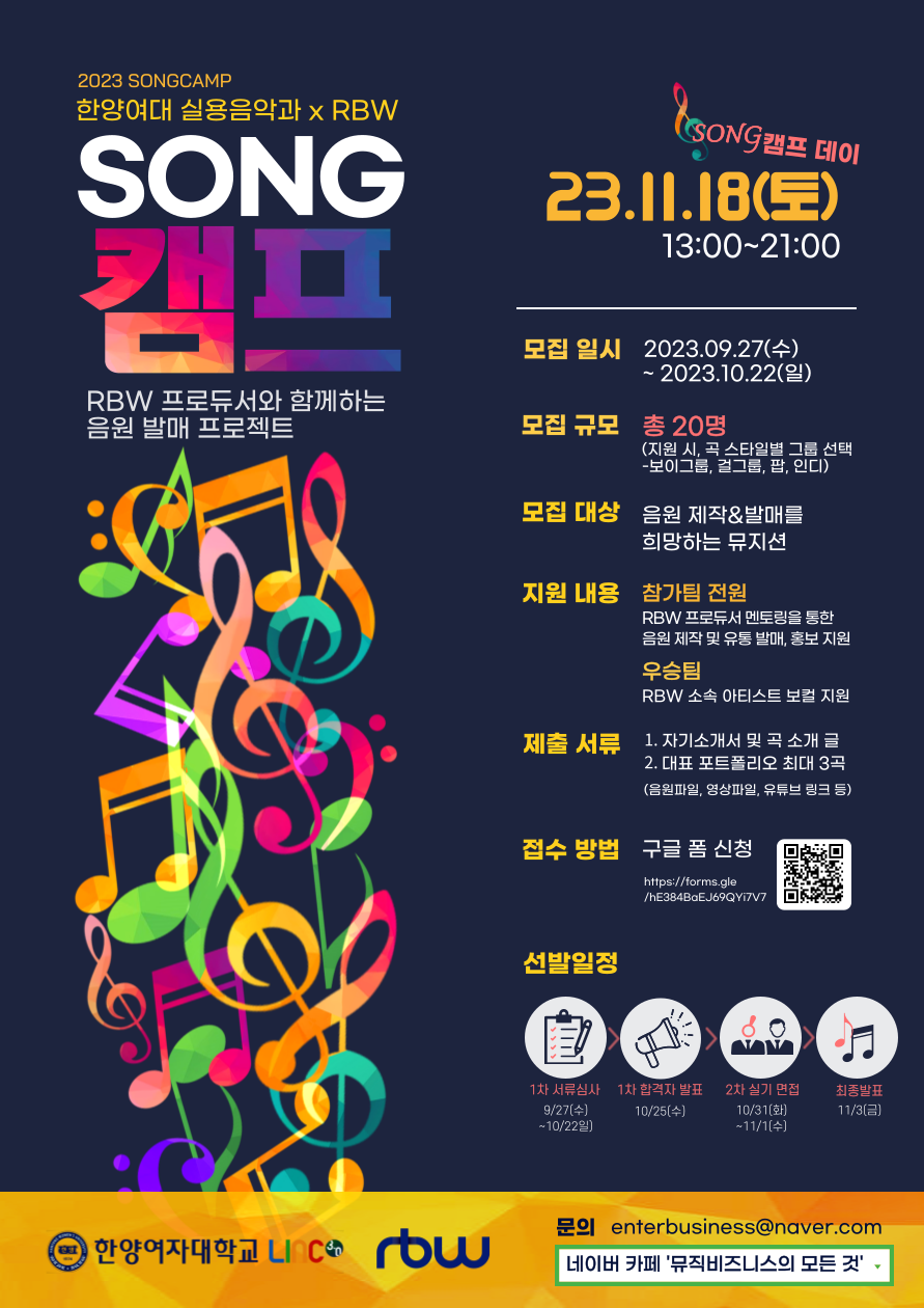 [한양여대 실용음악과 X RBW] RBW 프로듀서와 함께하는 2023 송캠프와 함께할 뮤지션을 모집합니다! 💕🎶 ~23.10.22