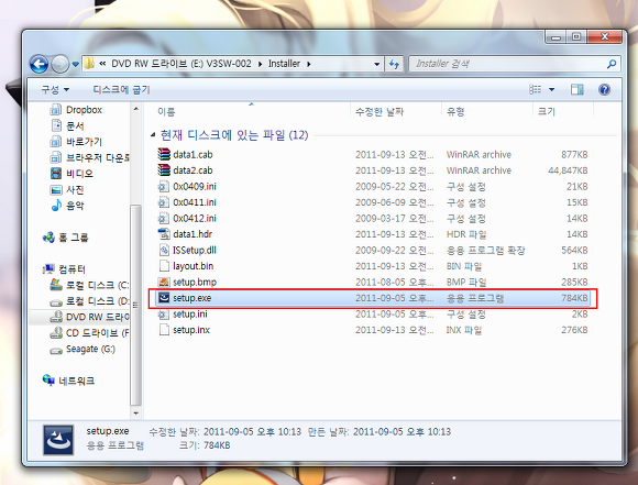 설치 DVD를 삽입해주시고 Installer 폴더에 있는 setup.exe 를 실행시킵니다.