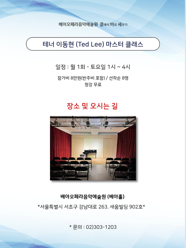 화려한 경력을 지니신 테너 이동현 선생님께서 지도해주시는 마스터 클래스이므로 믿고 따르셔도 됩니다.