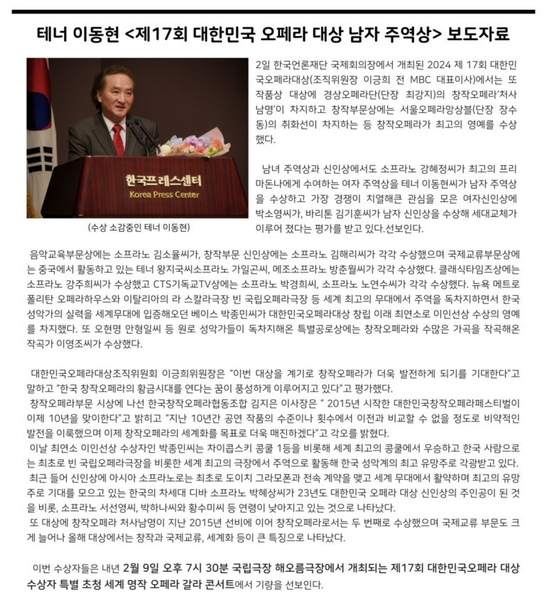 (테너 이동현 선생님이 '제17회 대한민국 오페라 대상 시상식' 에서 '남자 주역상' 을 시상하신 당일날 사진)