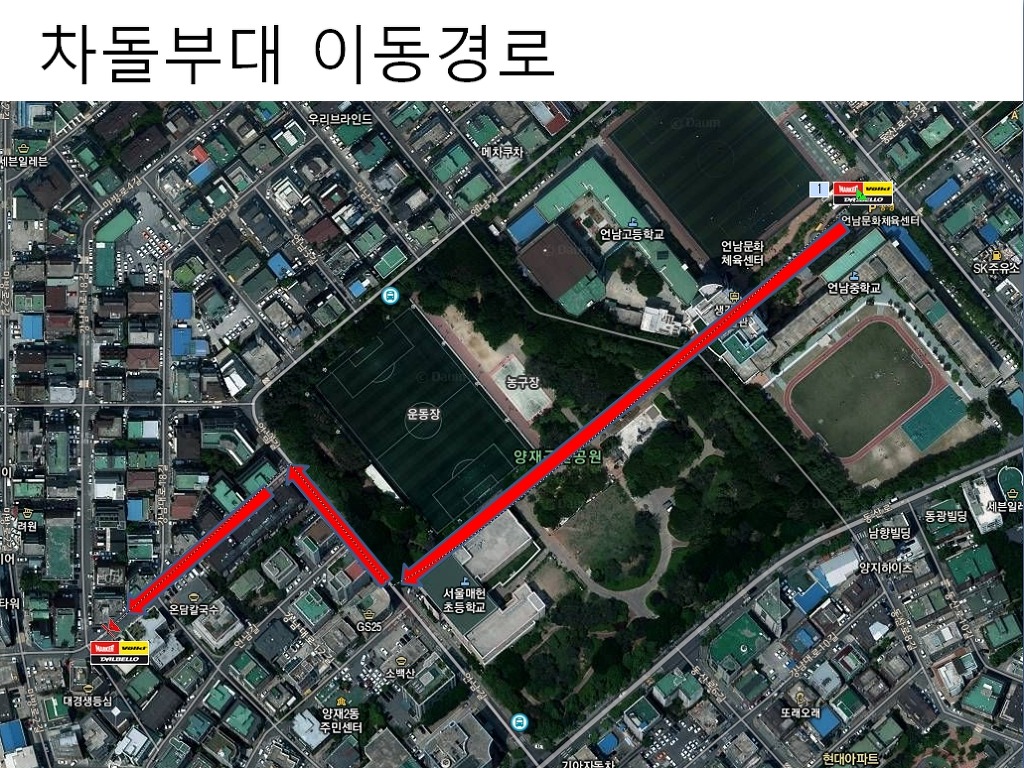 클리닉을 마친 후 언남문화체육센터에서 나와 양재근린공원을 가로질러 서울매헌초등학교쪽으로 이동합니다. 초등학교 뒤쪽에 위치한 일반도로에서 우회전을 하시고 약 40m 를 직진 후 좌측에서 두번째 골목으로 좌회전을 하고 약 100m 를 직진하시면 차돌부대라는 식당이 왼쪽에 위치하고 있습니다.