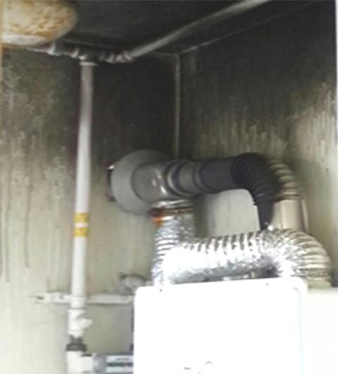 공동연도(‘06년이후폐쇄됨)를관통하여 설치된가스보일러의배기통이외부충격 (2/3정도 찌그러짐)에의해배기통연결부 가이탈되었고,외부충격에의해찌그러진 부분에응축수가고여있어보일러폐가스 가외부로방출되지못하고이탈된부분으 로누출되어일산화탄소중독으로1명이 사망하였고, 누출된보일러폐가스가화장실 환기구를따라확산되어 6층에살고있던1명도폐가스에의한일산화탄소중독으로 사망하였다