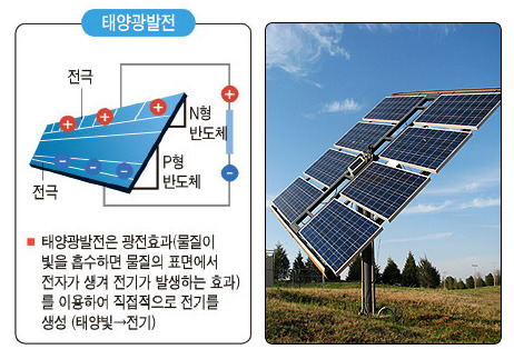 太陽光 發電(태양광 발전)은 무한정, 무공해의 태양 에너지를 직접 전기에너지로 변환시키는 기술이다. 기본 원리는 半導體(반도체) pn 接合(접합)으로 구성된 태양전지(solar cell)에 태양광이 照射(조사)되면 光(광)에너지에 의한 電子(전자)-陽孔(양공) 쌍이 생겨나고, 전자와 양공이 이동하여 n층과 p층을 가로질러 전류가 흐르게 되는 光起電力 效果(광기전력 효과;photovoltaic effect)에 의해 起電力(기전력)이 발생하여 외부에 접속된 負荷(부하)에 전류가 흐르게 된다. 이러한 태양 전지는 필요한 단위 용량으로 直(직)·竝列(병렬) 연결하여 기후에 견디고 단단한 재료와 구조의 만들어진 태양전지 모듈(solar cell module)로 상품화 된다.