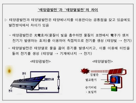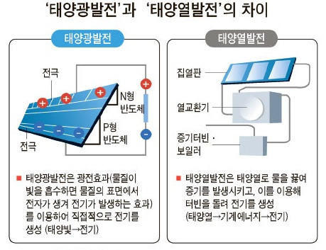 미래의 에너지로 통하는 태양을 이용한 발전(發電)은 전 세계의 유행이다. 지금까지 한국에서 주로 많이 시도된 것은 태양열(熱) 발전이 아니라 태양광(光) 발전이었다. 해를 이용하는 것은 같지만 차이점도 크다.