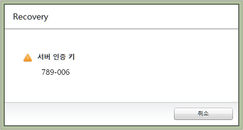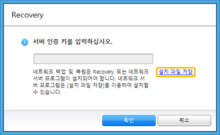 4.복원 모드로 부팅된 후 서버 인증 키 입력창이 나타나면 이미지가 저장된 시스템에서 보여주는 인증 키를 입력하고 확인을 누릅니다.