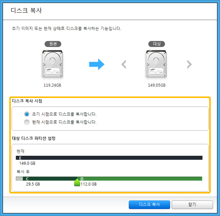 4.디스크 복사 시점을 선택하고 대상 디스크의 파티션 크기를 설정합니다.