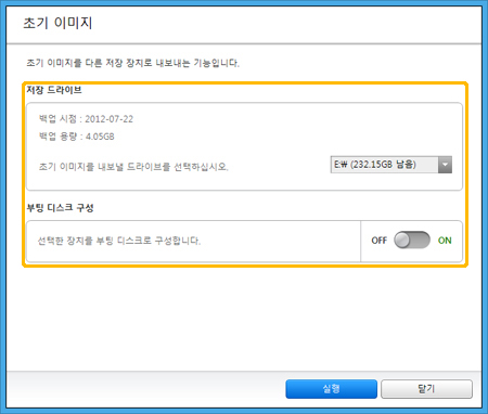 외장 저장장치에 백업할 경우 외장 저장장치를 부팅 디스크로 생성할 수 있습니다. Windows로 부팅이 되지 않을 경우 외장 저장장치로 부팅하여 이전 상태로 시스템을 복원할 수 있습니다. 단, 부팅 디스크로 생성 시 저장 장치내의 데이터는 삭제되고 포맷됩니다