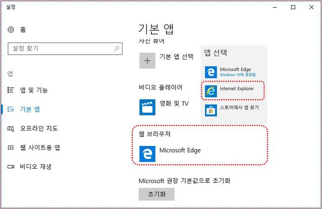 기본앱-> 웹브라우저 설정이 Microsoft Edge 되어있는것을