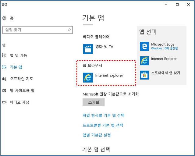 앱선택 항목에서 Internet Explorer 를 선택하면