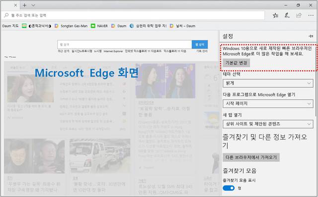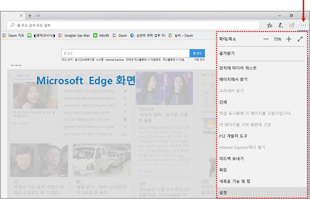 Microsoft Edge창에서 변경하는 방법 창오른쪽 상단 … 클릭->설정