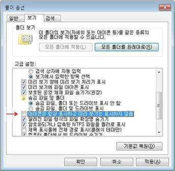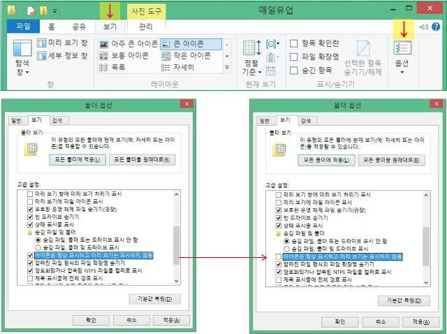 폴더옵션창->보기-> 아이콘은 향상표시하고 미리보기는 표시하지않음 -체크해제