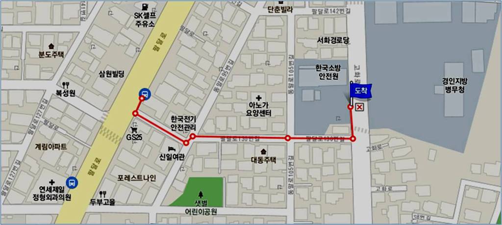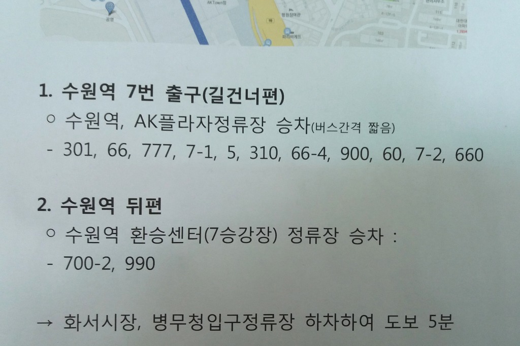 -> 수원역-> 화서시장,병무청입구에서하차-> 도보로이동-> 병무청앞 소방안전교육원