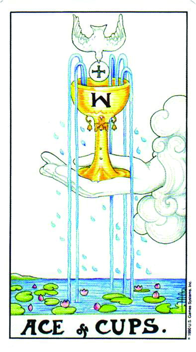 카드에는 성배 위로 하늘에서 손이 뻗어 있고, 성배에서 다섯 줄기의 물이 아래로 흘러내립니다. 잔 위에는 흰 비둘기가 내려앉고 있으며, 물결은 연못으로 이어지며 감정의 순환과 흐름을 상징합니다.