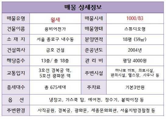 [스크랩] <광화문 오피스텔>용비어천가18평(59㎡)월세1000/83스튜디오형/종로월세/광화문월세/소형사무실월세
